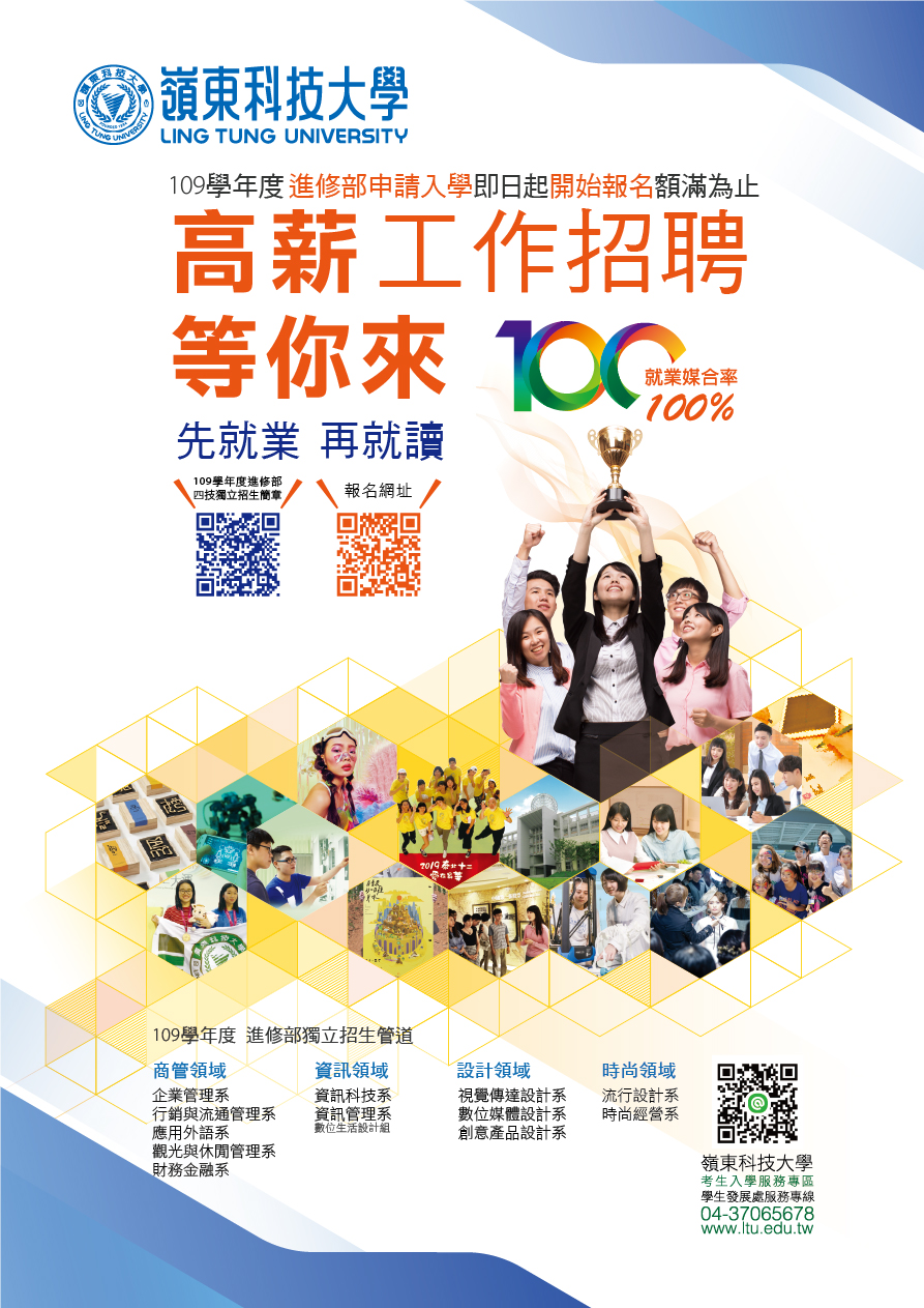 一、招生報名日期為109年4月8日(週三)中午12時起至109年8月5日(週三)中午12時止,網路報名系統網址:http://utc.ltu.edu.tw。三、招生諮詢單位:學生發展處,服務專線:04-23849482;04-23892088#1234;04-37065678。