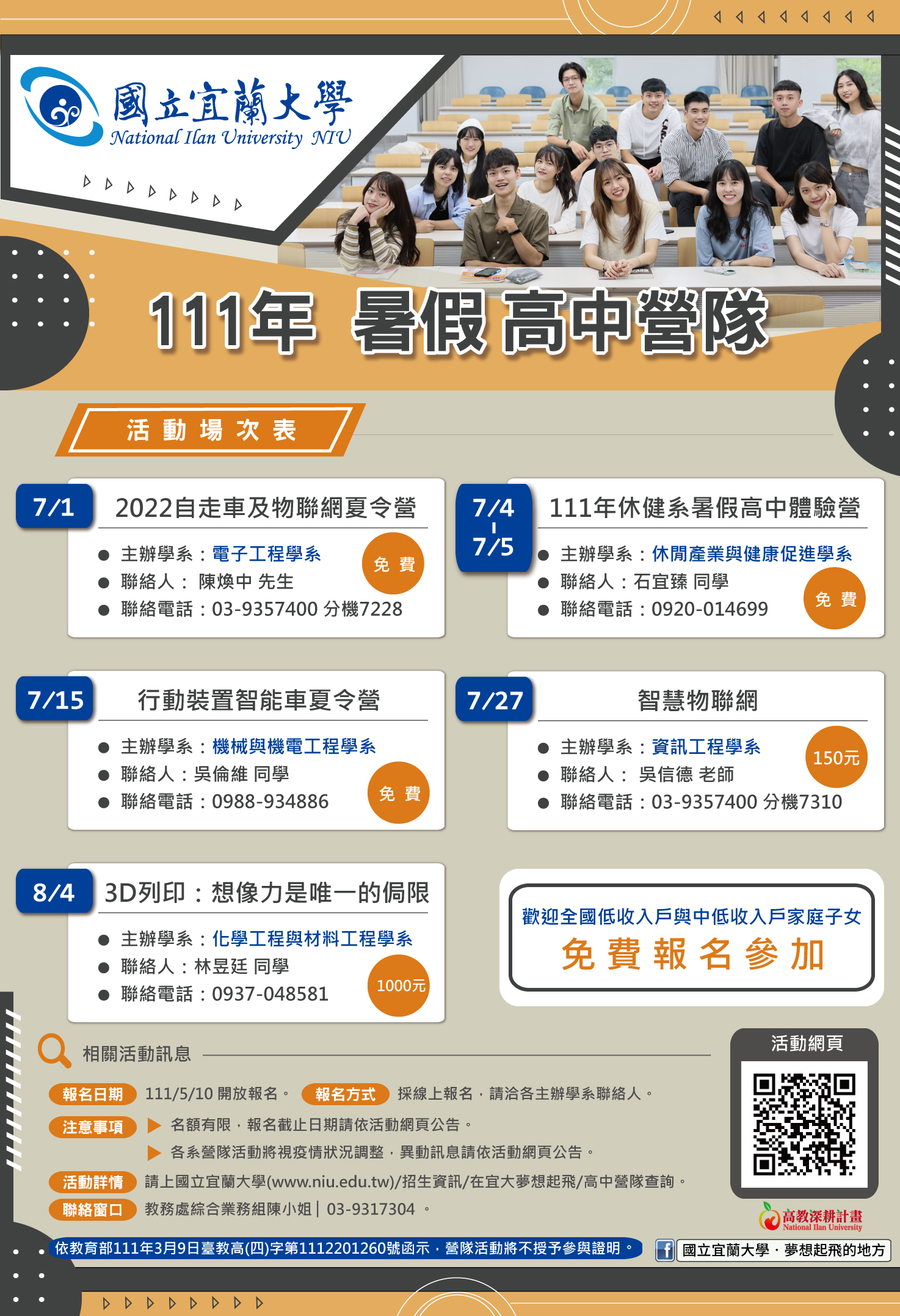 或由國立宜蘭大學首頁(網址:https://www.niu.edu.tw)/招生資訊/在宜大夢想起飛/高中營隊查詢。