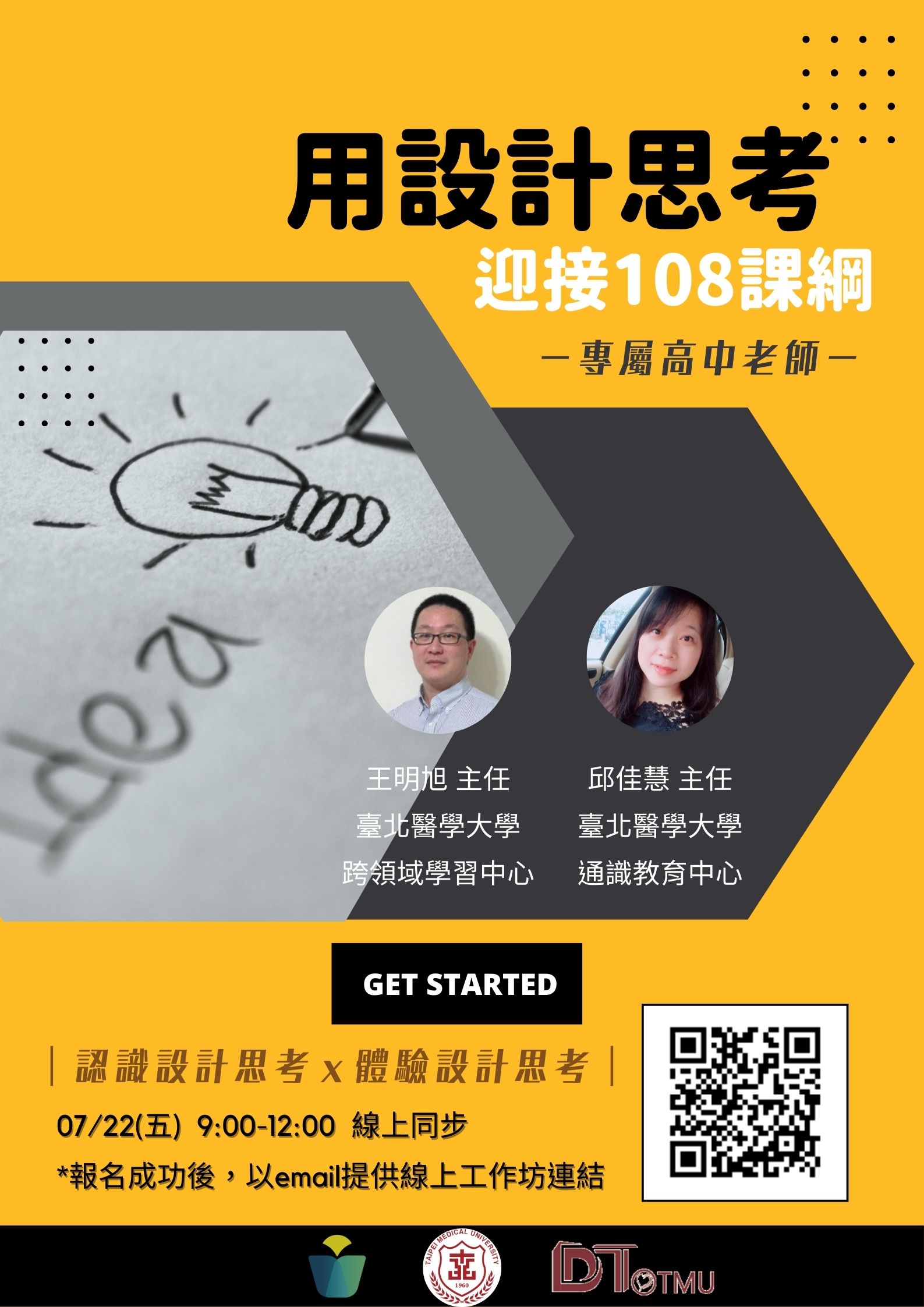 台北醫學大學協辦教育部苗圃計畫,特舉辦「用設計思考迎接108課綱工作坊」,檢送工作坊海報