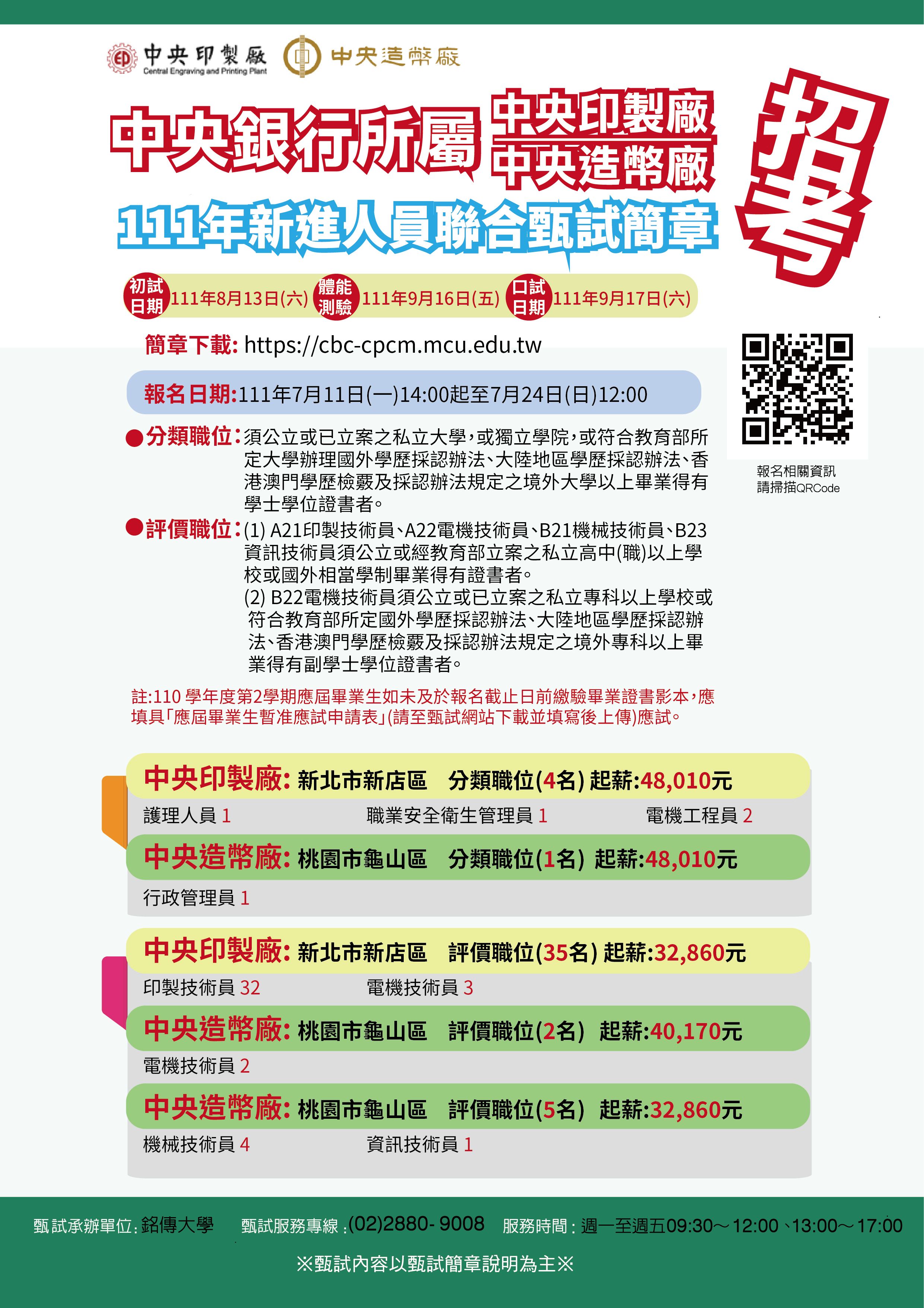 銘傳大學辦理中央銀行所屬中央印製廠、中央造幣廠 111年新進人員聯合甄試簡章