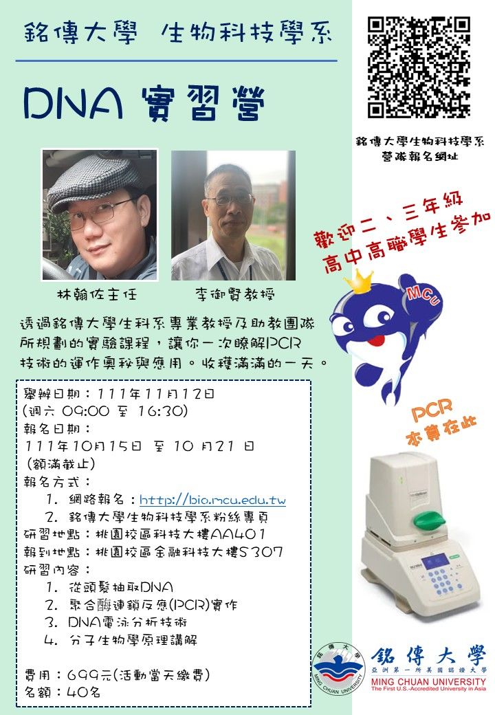 銘傳大學將於111年11月12日(星期六)舉辦「DNA實習營」