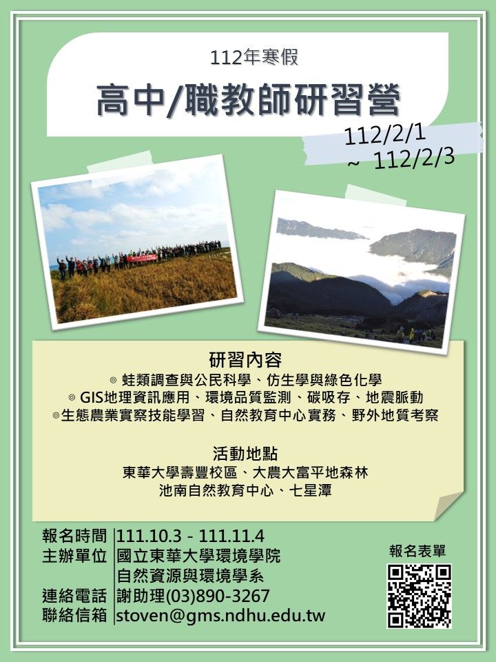 國立東華大學自然資源與環境學系擬於明年(112年)2月1日(三)至2月3日(五)舉辦