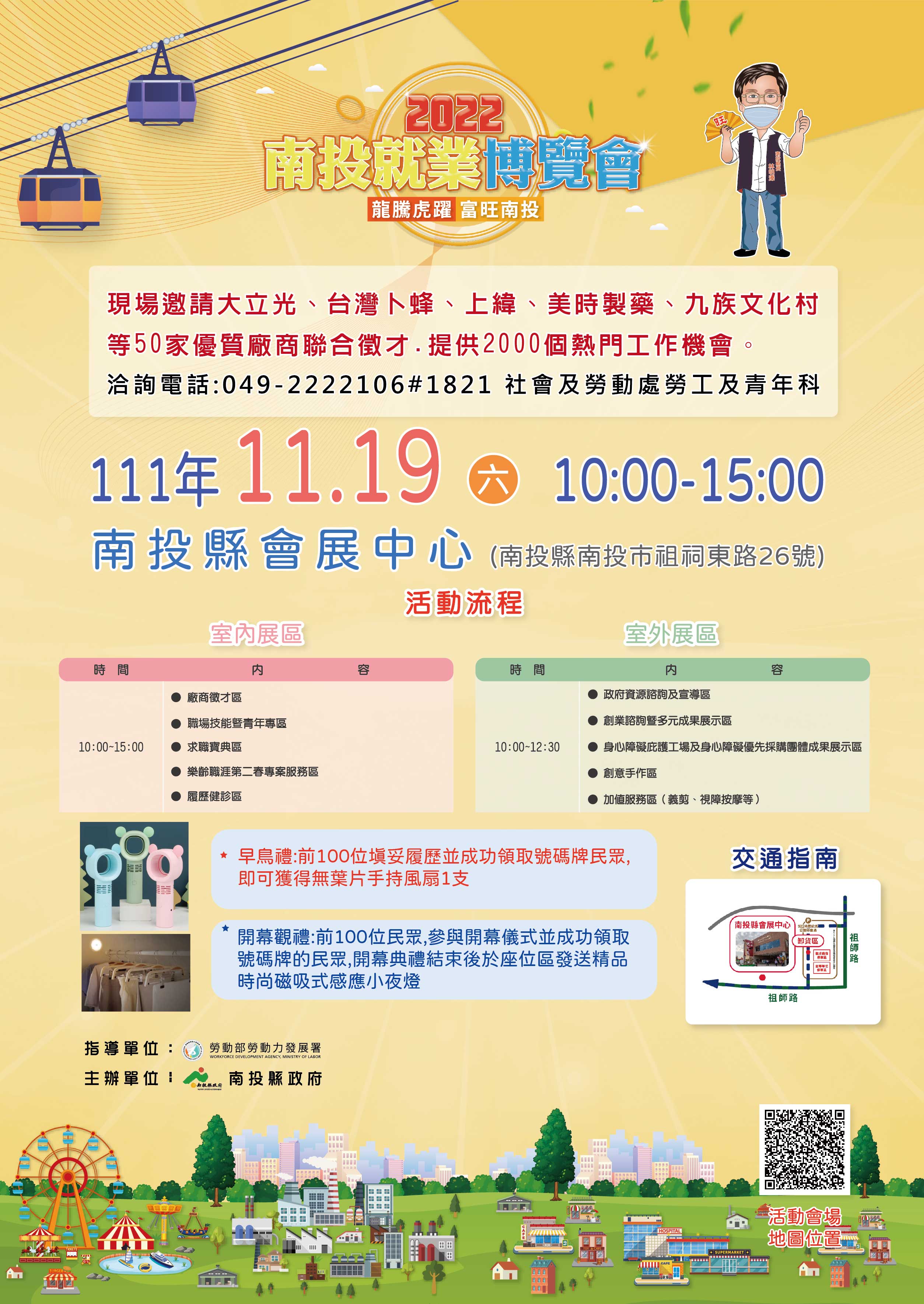 訂於111年11月19日(星期六)上午10時至下午3時,假南投縣會展中心(南投縣南投市祖祠東路26號)辦理。現場邀請大立光、台灣卜蜂、上緯、美時製藥、九族文化村等50家優質企業,提供2,000個職缺。