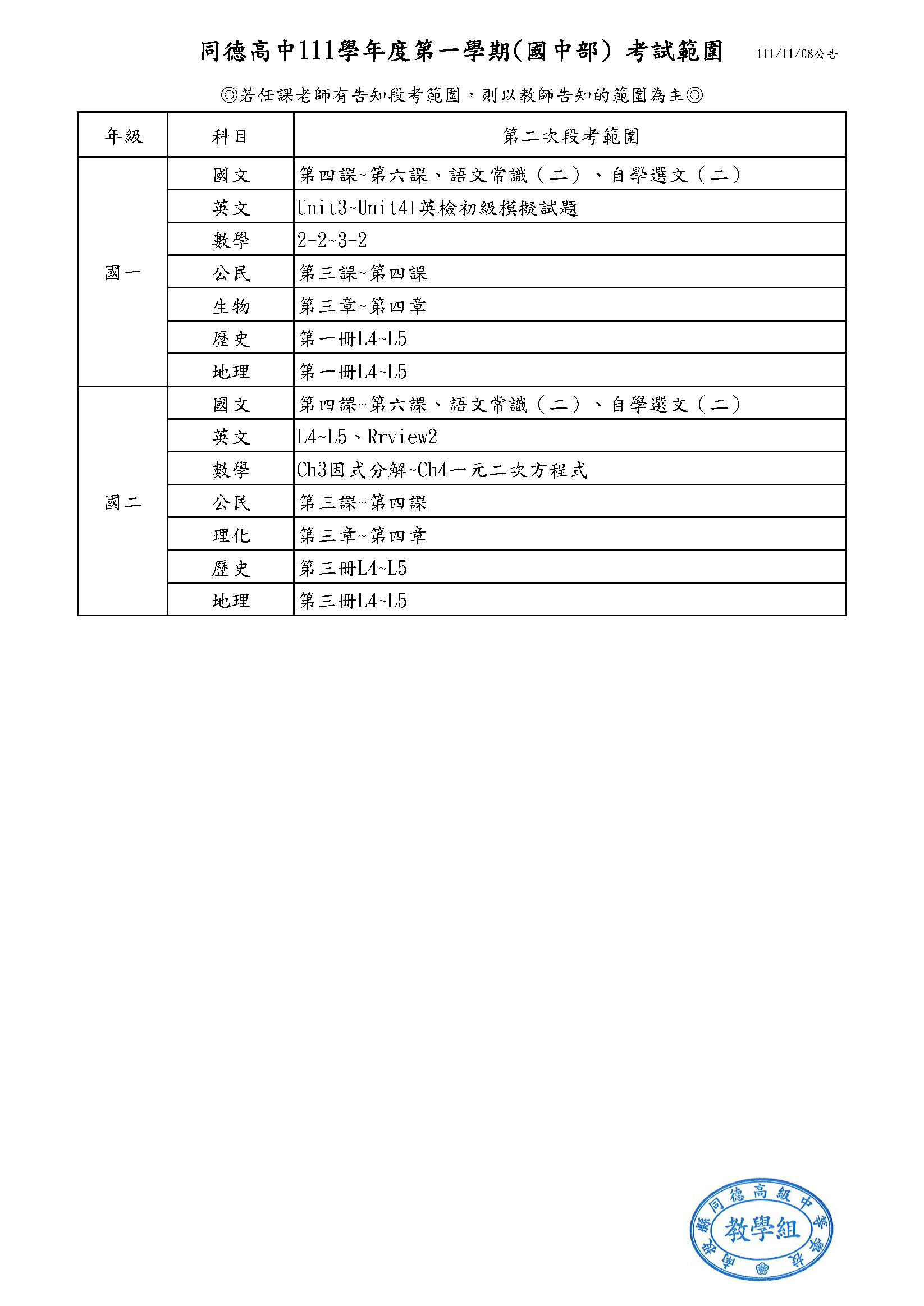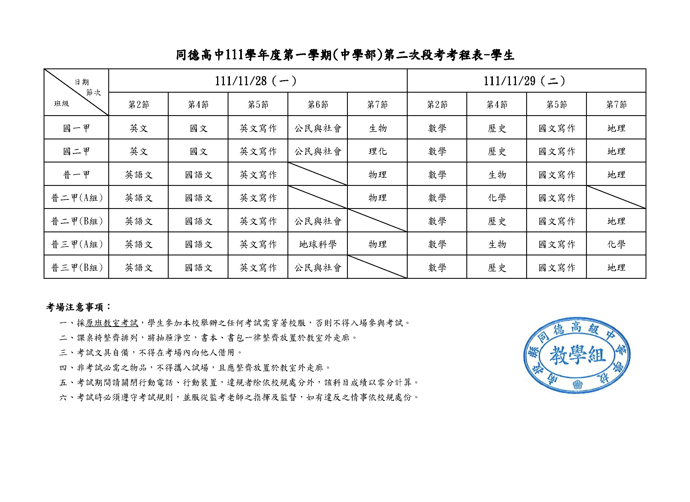 同德高中111學年度第一學期(中學部)第二次段考考程表及考試範圍