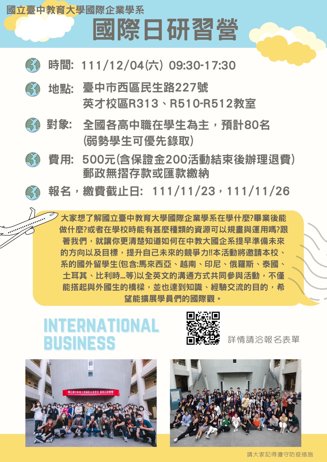 (一)直接在附件之國際日研習營海報→掃描 QR code 或至系網頁http://ib.ntcu.edu.tw/→最新公告→國際日研