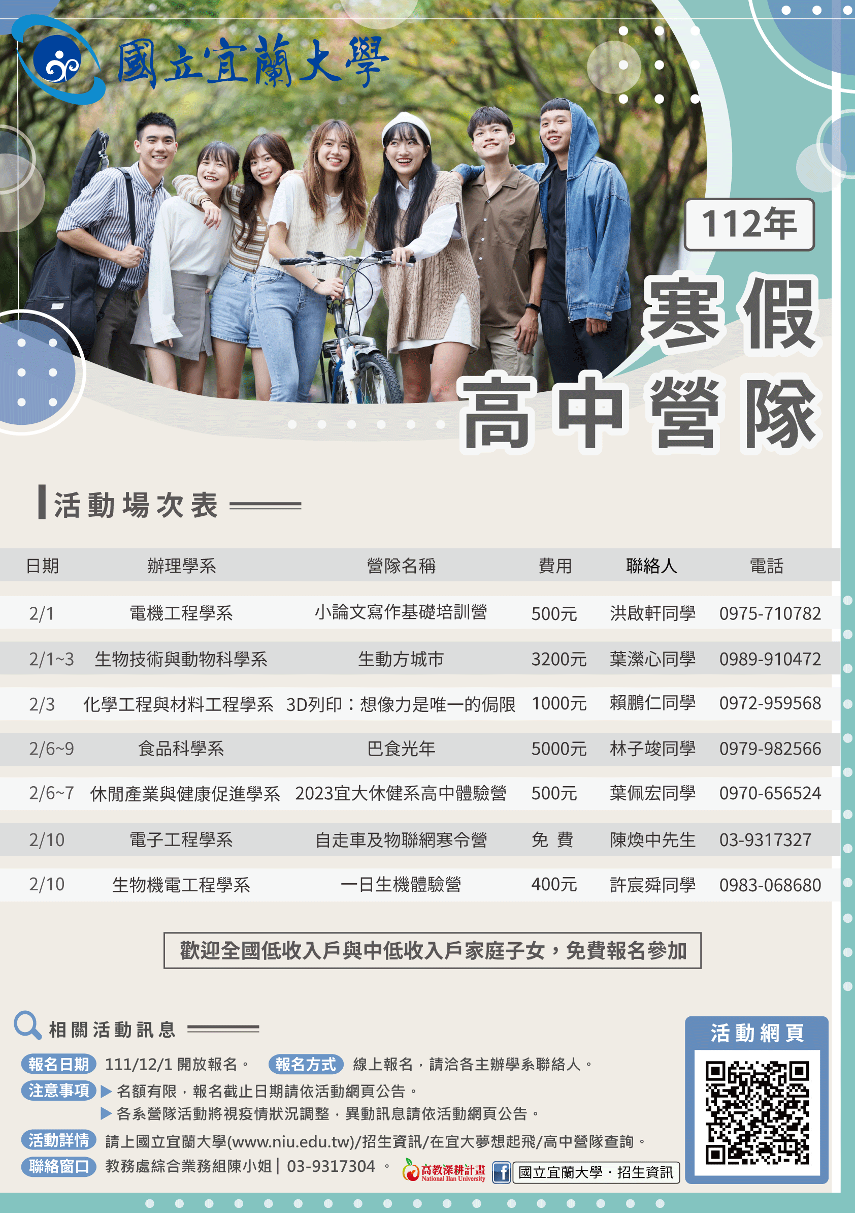 網址:https://sites.google.com/ems.niu.edu.tw/niucamp112winter),或由國立宜蘭大學首頁(網址:https://www.niu.edu.tw)/招生資訊/在宜大夢想起飛/高中營隊查詢。