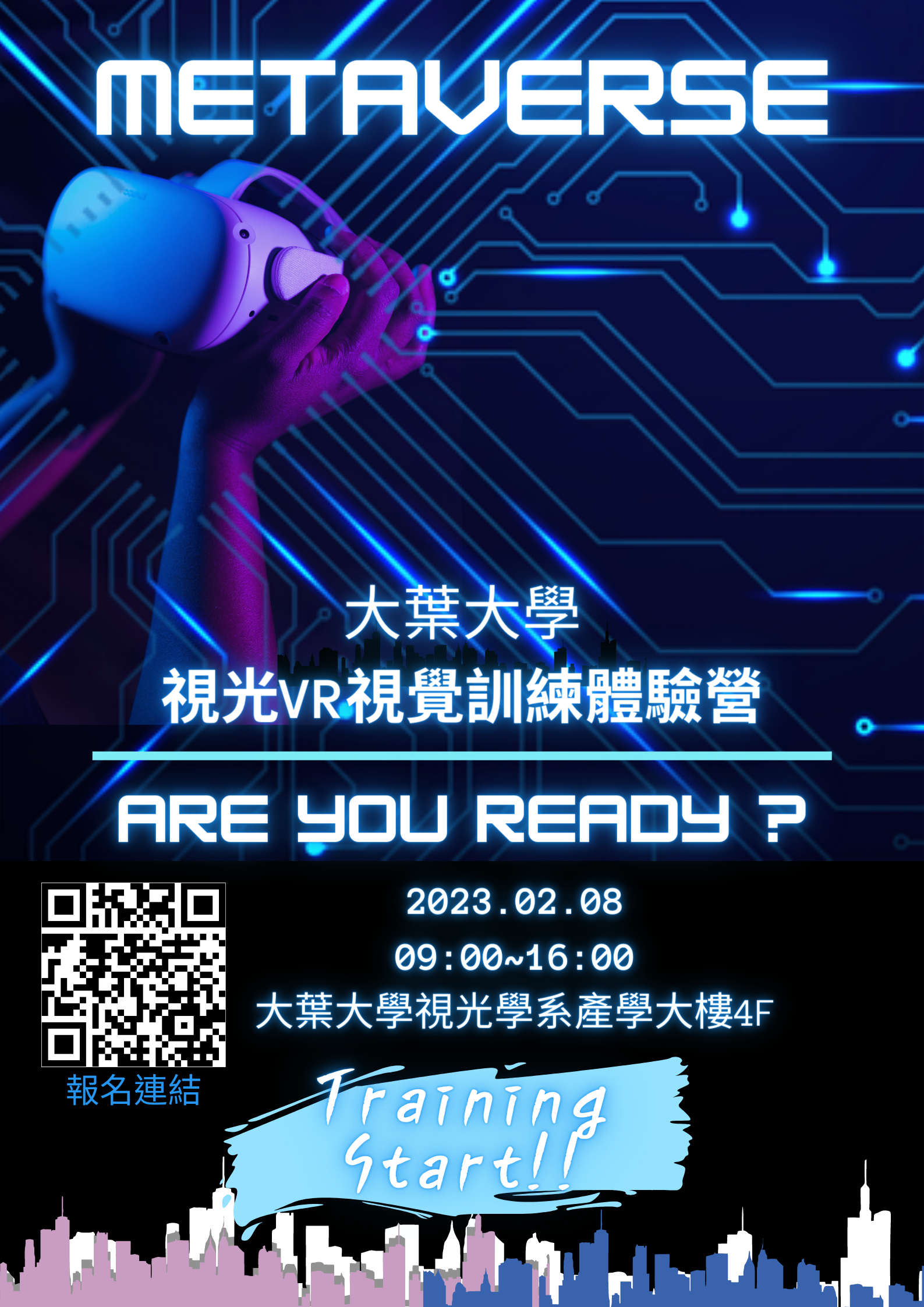 一、主辦單位:大葉大學視光學系系學會。二、協辦單位:大葉大學視光學系。三、活動日期:民國112年02月08日(三) 9:00-16:00;大葉大學產學大樓。四、參加對象:全國高中職生,人數20名,備取10名。五、報名方式:https://reurl.cc/10ev1p。或電洽大葉大學視光學系04-8511888轉分機7231楊小姐。