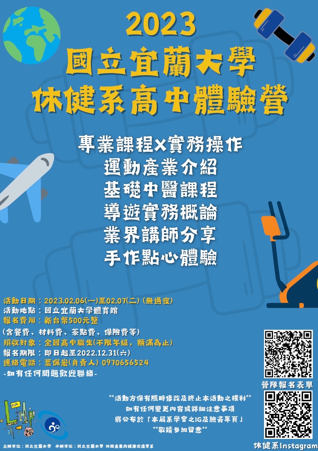 說明:一、旨揭設計高中體驗營,期望透過專業課程搭配實務操作的角度,讓有志於從事觀光休閒與運動健康領域的高中生,提前了解休健系所學以及未來方向。二、活動時間:112年2月6日、2月7日。三、活動地點:國立宜蘭大學體育館。四、活動對象:全國高中職生(不限年級,額滿為止)。五、活動負責人:休健三 葉佩宏同學(0970-656524)六、活動網頁暨報名資訊:https://reurl.cc/mZ2daG。七、檢附活動海報一份。