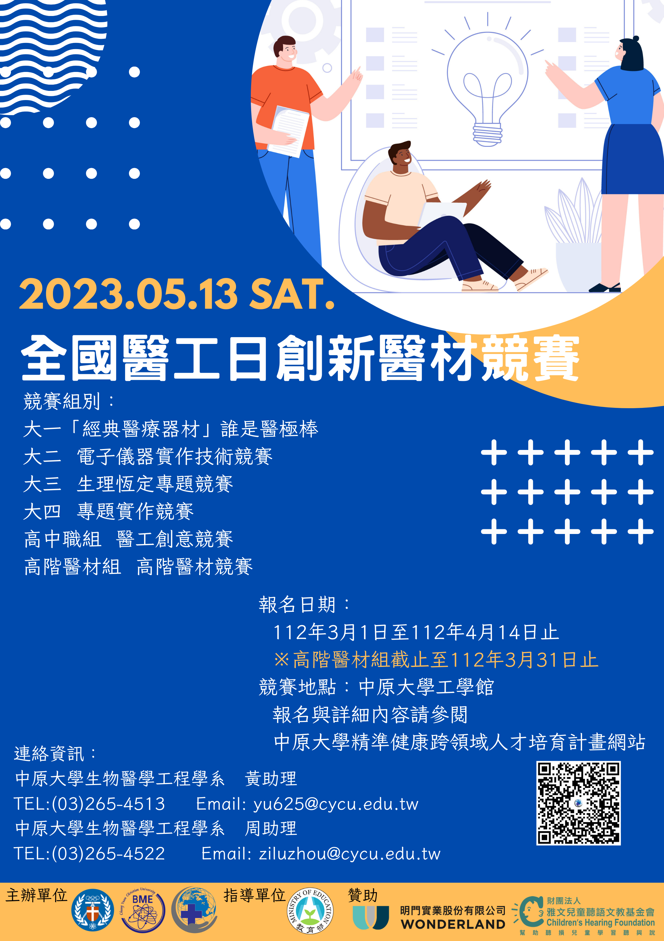 說明:一、參加對象:凡就讀教育部立案之高中職校在學學生。二、競賽日期:112年5月13日(星期六)。三、競賽地點:本校工學館。四、競賽名稱:醫學工程創意競賽。五、報名及資料繳交方式:自3月1日起,詳細內容請參考活動網頁。六、活動網址:https://ppt.cc/fqTXdx。