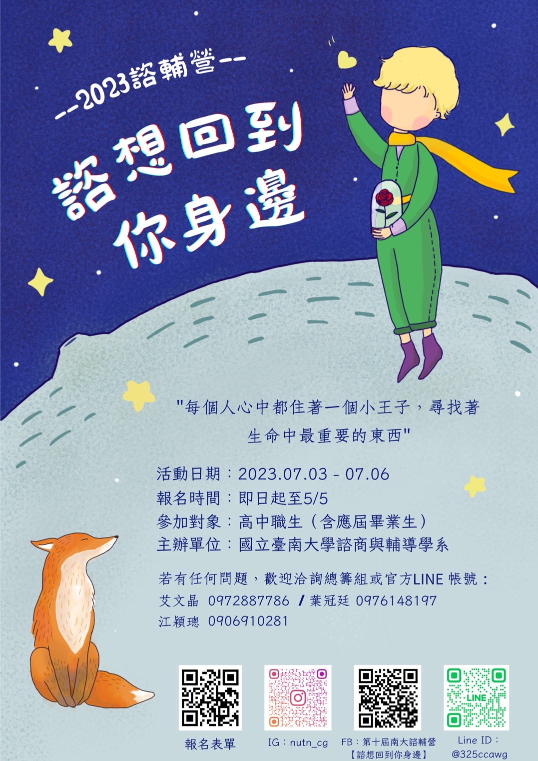 一、活動名稱:臺南大學第十屆諮輔體驗營-諮想回到你身邊。