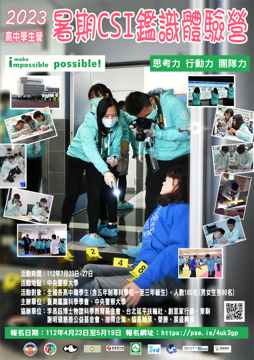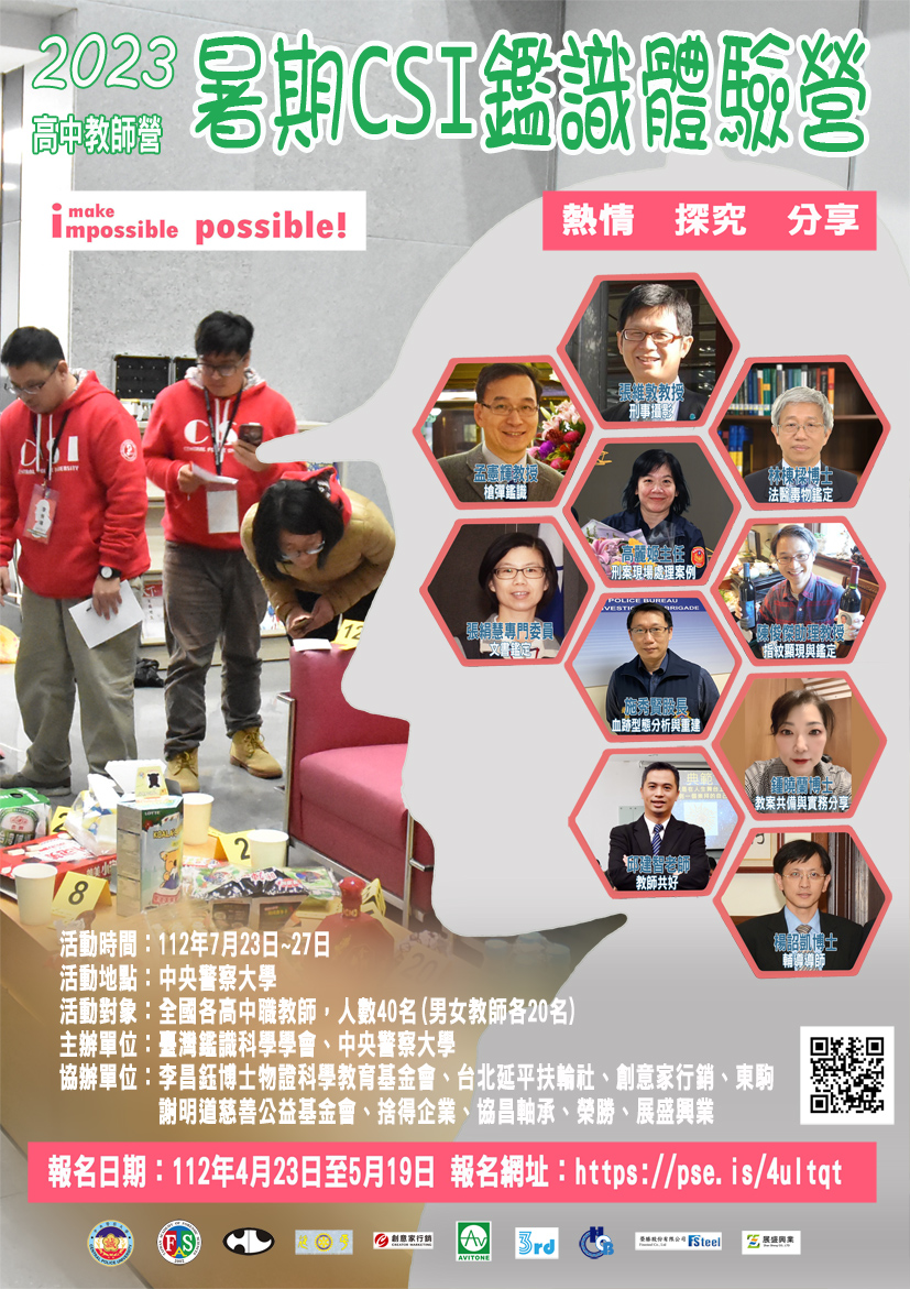 說明:本營隊活動招收高中教師40位學員(女生20位,男生20位),高中學生160位學員(女生80名,男生80名)。報名簡章及海報請參閱附件或至活動網站 https://www.facebook.com/TAFS.CSI/下載。