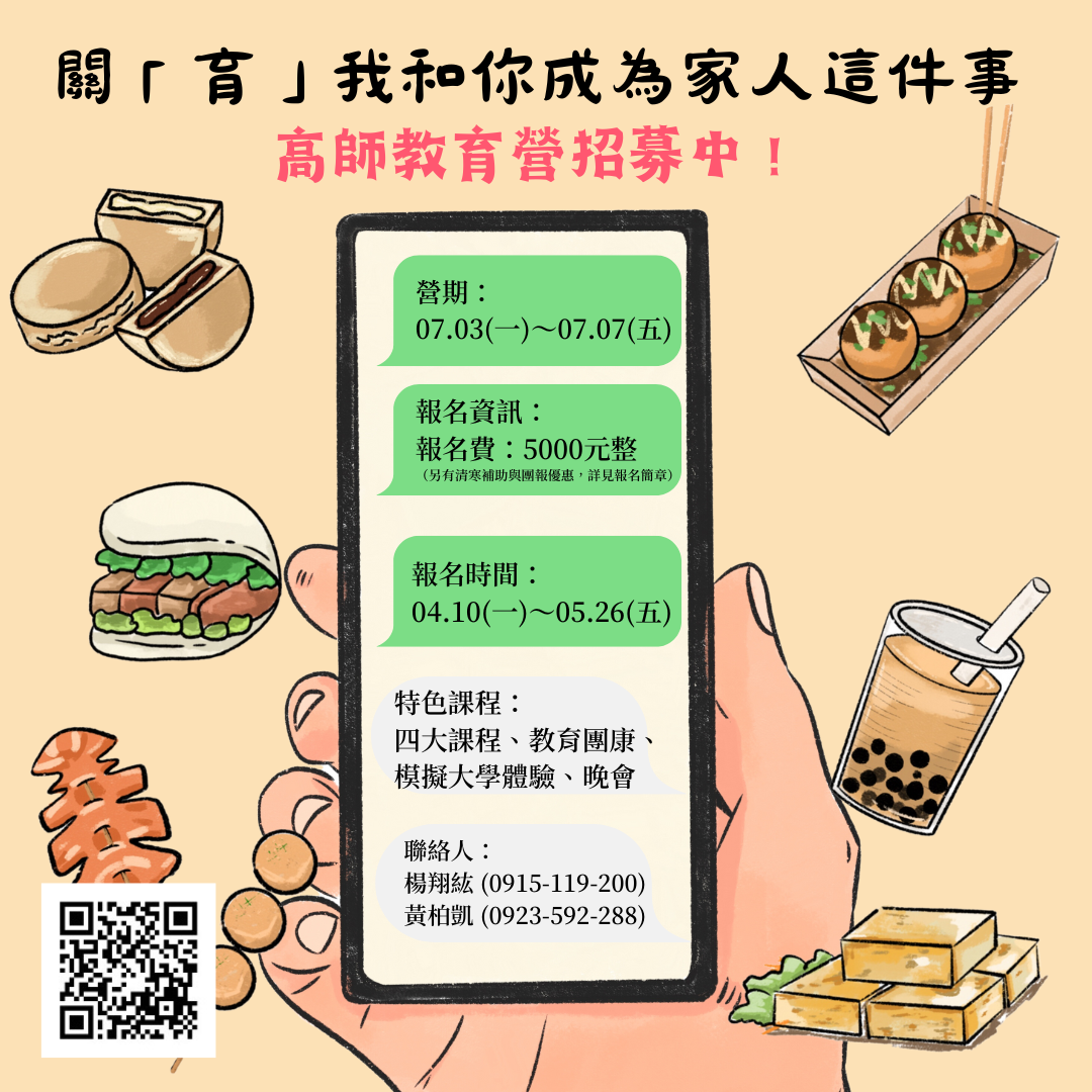 說明:一、活動名稱:2023高師大教育營《關「育」我和你成為家人這件事》。二、活動時間:112年7月3日至9日(週一至週五),五天四夜。三、招收對象與名額:全國高中職學生,共50名。四、報名時間:即日起至112年5月26日止。五、報名方式及相關訊息詳見活動簡章或官網:Facebook搜尋2023高師大教育營《關「育」我和你成為家人這件事》