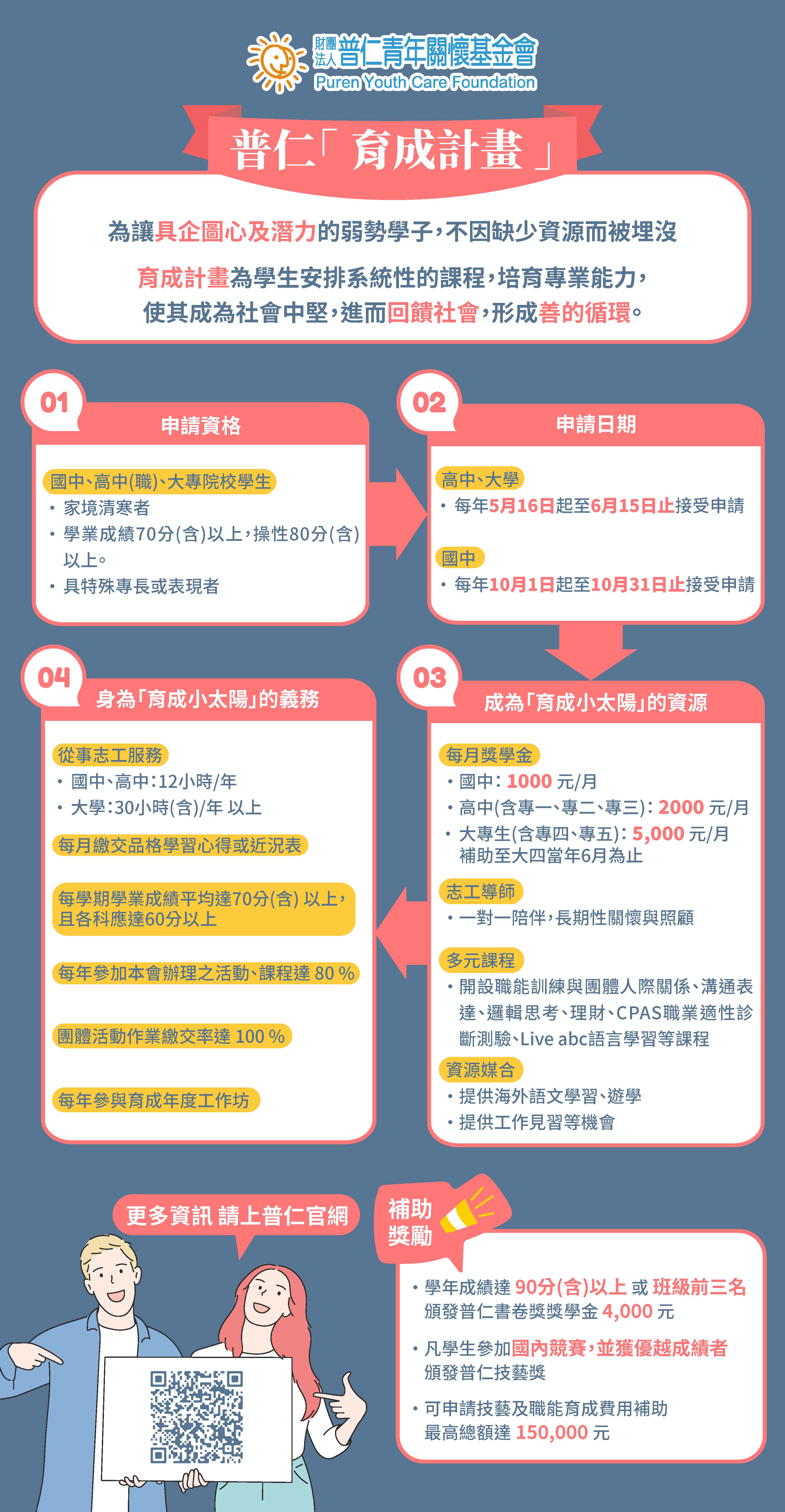 申請時間為112年5月16日起至111年6月15日(郵戳為憑),相關申請辦法請至本會網站:(http://www.youcare.org.tw/Default.aspx)首頁,於育成計畫下載專區中下載「112年度育成計畫」及「112年育成計畫申請表格」。