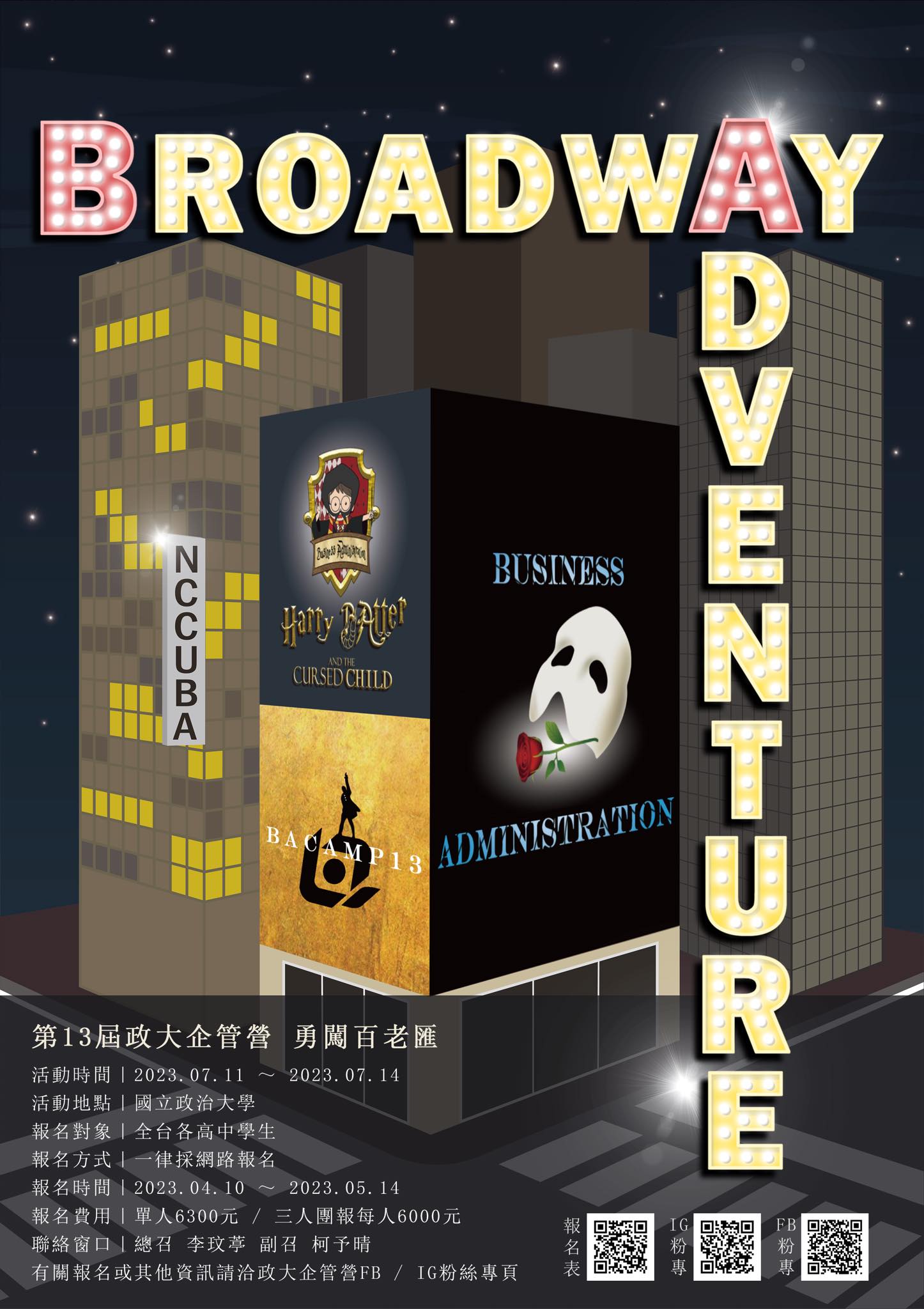 一、企管營係為促進全國高中職學生對於本系有更進一步認識,營隊設計多項企管相關課程,藉由活潑的活動將學術與實務層面結合,並使學員於營隊中學習團體溝通與合作,敬請惠予宣傳,鼓勵所屬學生參加。二、第十三屆企管營活動期間為112年7月11日至14日,為期四天三夜,報名延期至112年5月21日,詳請參閱營隊網址:https://www.facebook.com/nccubacamp。