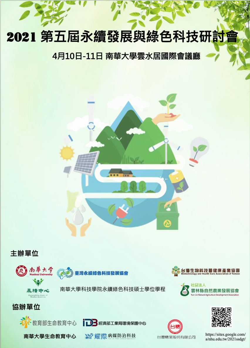 南華大學於110年4月10日及4月11日辦理「第五屆永續發展與綠色科技研討會」及 「2021 2nd International Conference on Sustainable Development Goals : Climate Change and Green Technology」海報