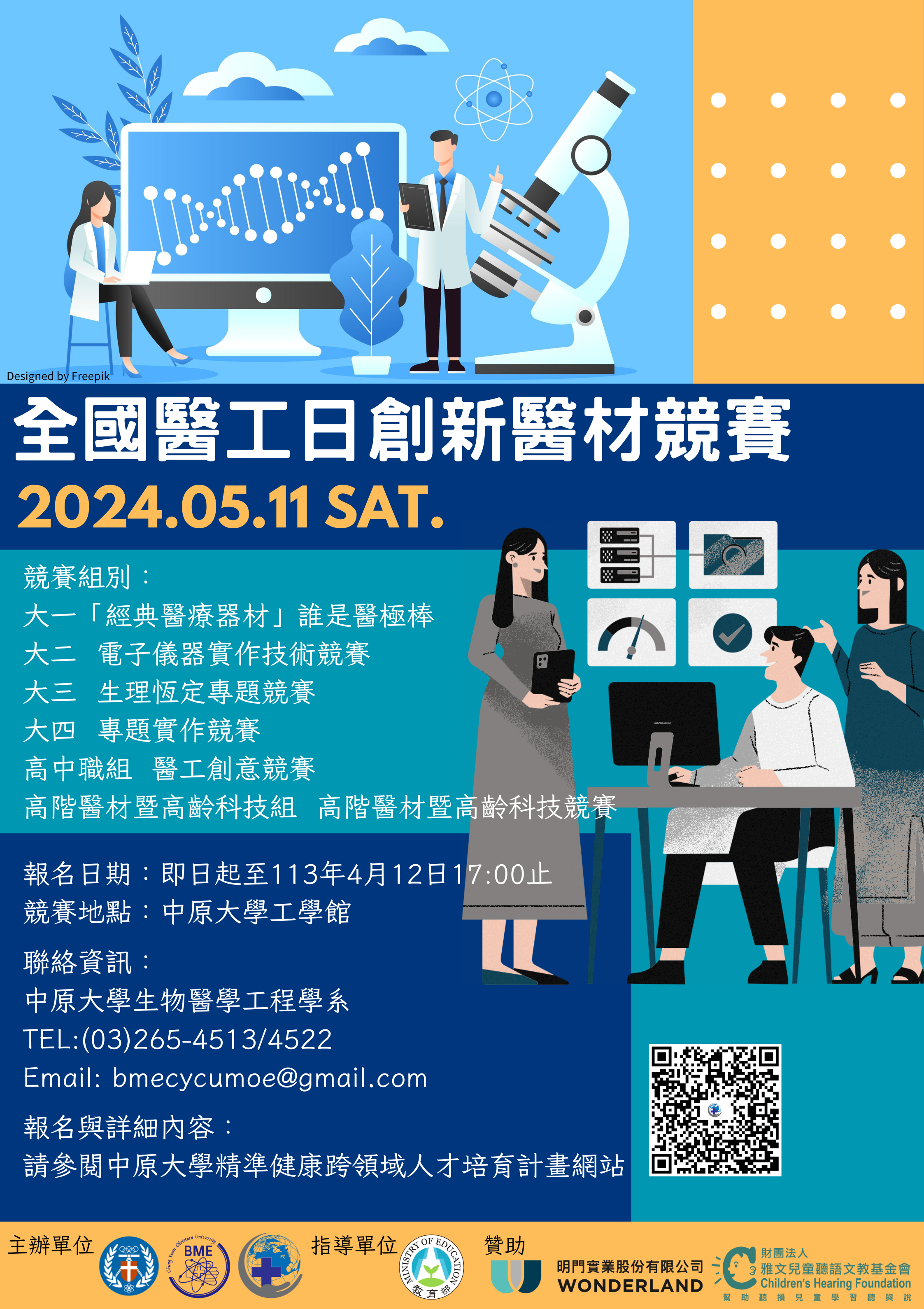 說明:一、參加對象:凡就讀教育部立案之高中職校在學學生。二、競賽日期:113年5月11日(星期六)。三、競賽地點:本校工學館。四、競賽名稱:醫學工程創意競賽。五、報名及資料繳交方式:即日起開始報名,詳細內容請參考活動網站內之競賽辦法。六、活動網址:https://reurl.cc/v0xE9l。
