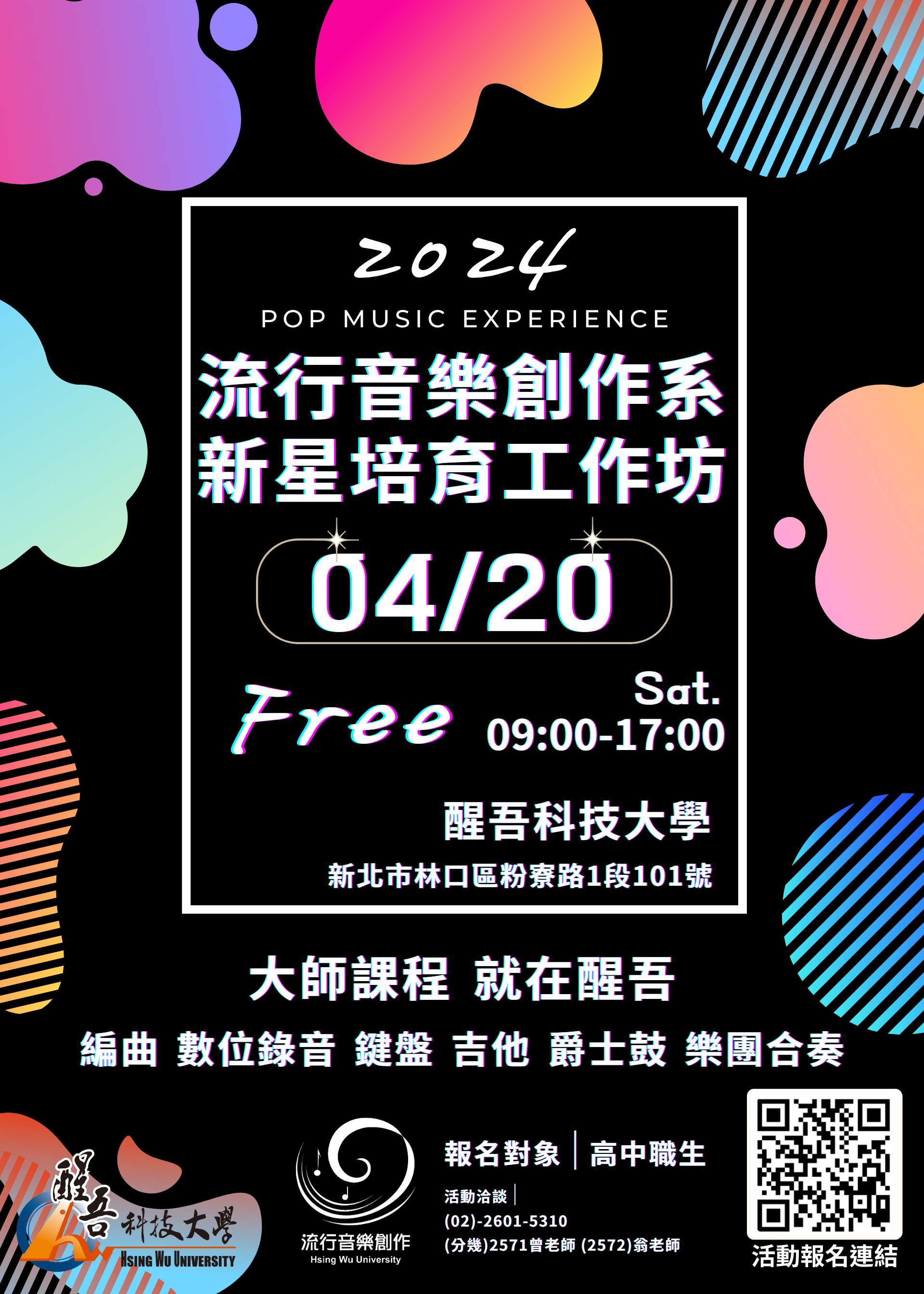 說明:一、報名日期:即日起至4/15止。二、相關活動訊息請至醒吾科技大學流行音樂創作系最新消息(https://c016.hwu.edu.tw/Category?CId=2482) 查詢,活動聯絡人;曾秀美老師,(02) 26015310分機2571三、海報文宣,如附件。