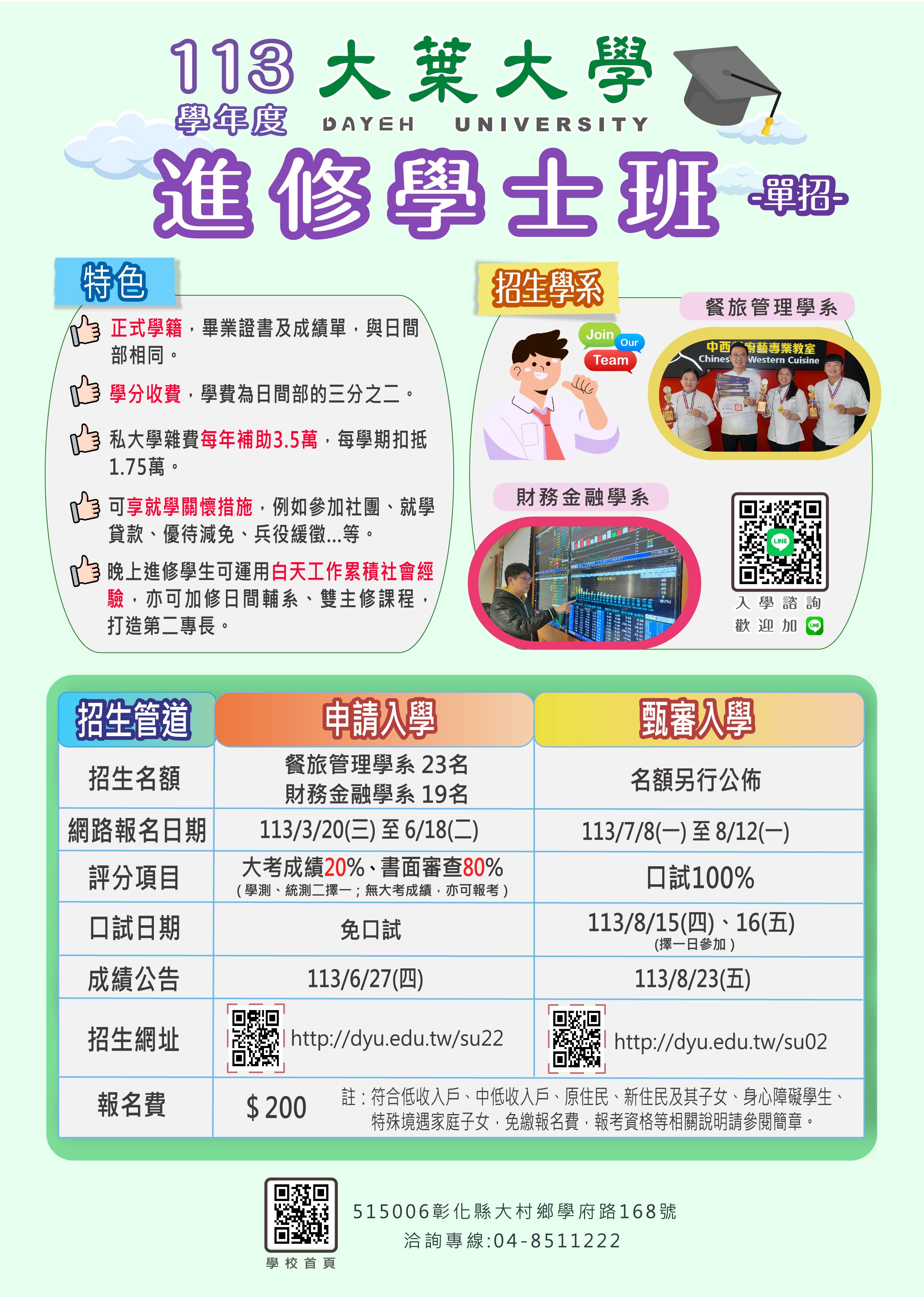 ▲報名請至招生系統,網址:http://dyu.edu.tw/su22 (點選「招生資訊」-「進修學士班申請入學」)