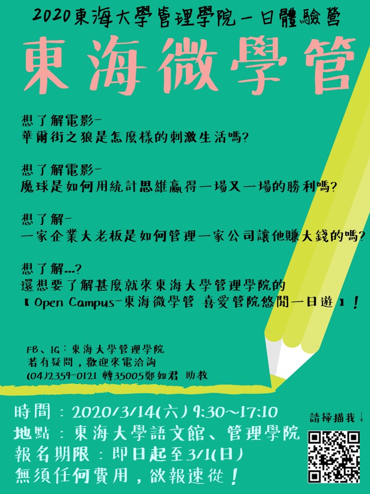 東海大學管理學院謹定於本(109)年3月14日(星期六)為全國高中職學生舉辦「2020東海大學管理學院一日體驗營-東海微學管:喜愛管院悠閒一日遊」活動.pdf
