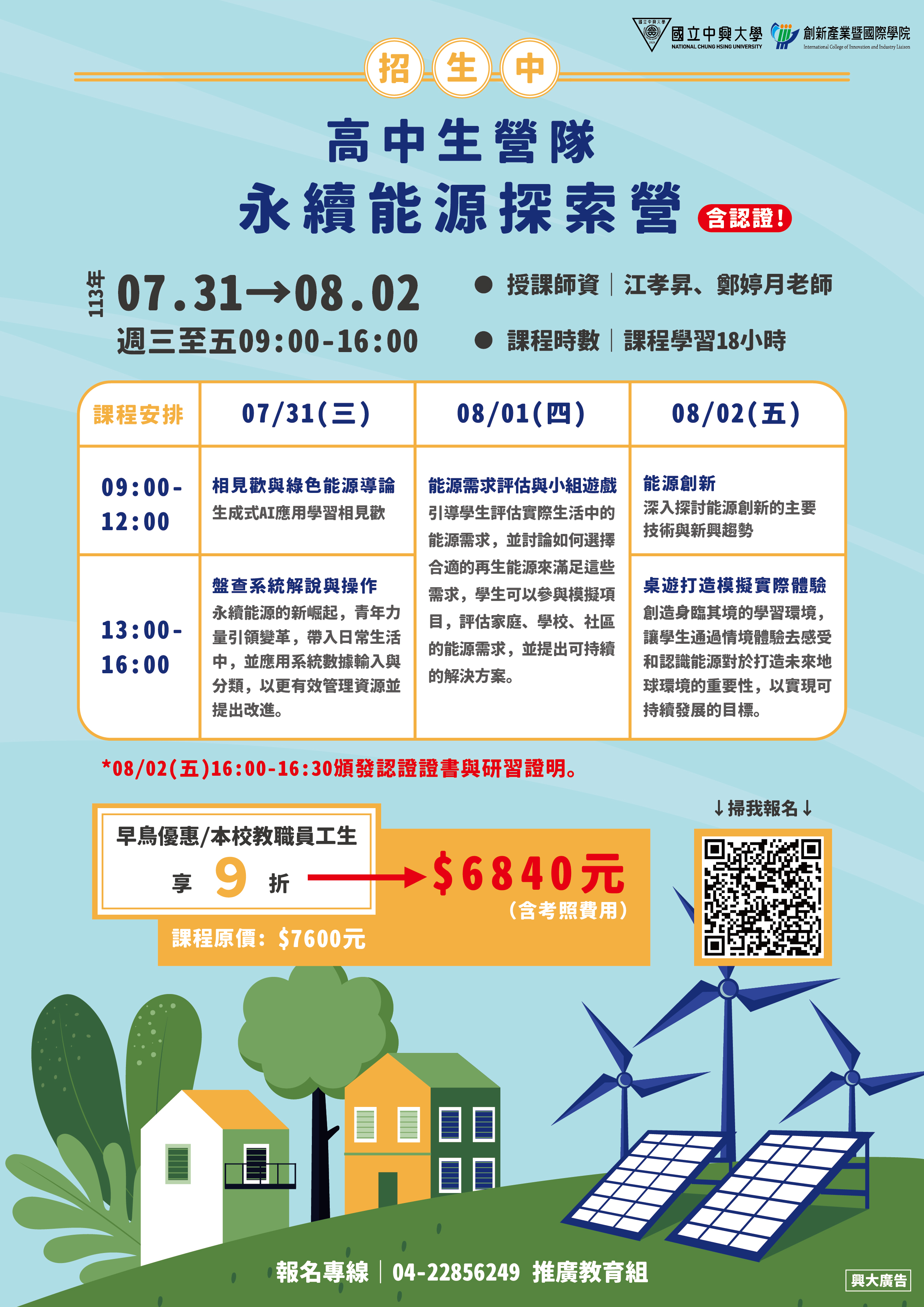中興大學推廣教育辦理「永續能源探索高中營(含認證)」招生訊息