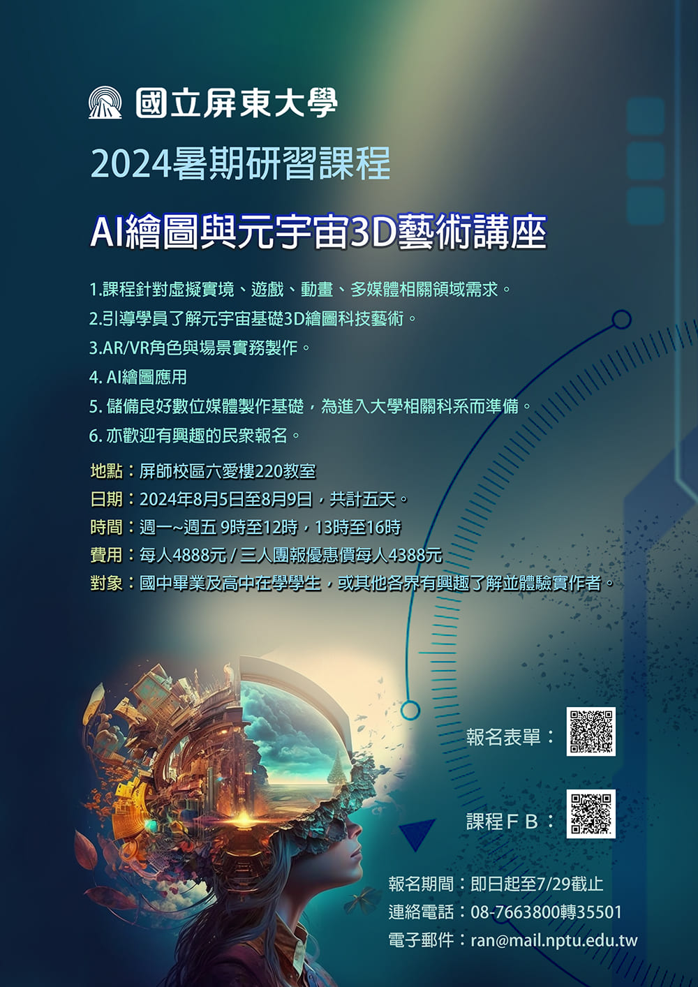 說明:一、旨揭課程針對虛擬實境、遊戲、動畫及多媒體技術有興趣之學員,培訓數位媒體製作基礎,為進入大學相關科系而準備。二、課程培訓期間:113年8月5日至9日。三、詳細報名資訊可直接連結以下網址填寫(https://forms.gle/7CDQ3bk3p7W4zaNc8),並檢附活動海報,敬請酌參。四、課程洽詢電話:(08)7663800分機35519,黃小姐。