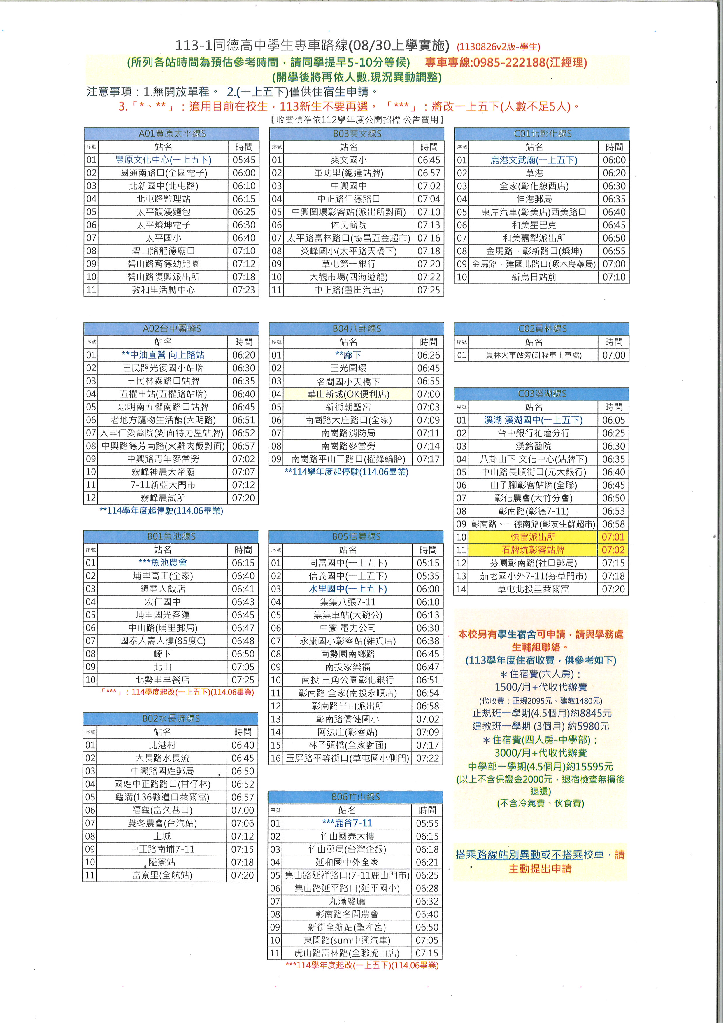 (所列各站時間為預估參考時間,請同學提早5-10分等候) 專車專線:0985-222188(江經理)(開學後將再依人數.現況異動調整)