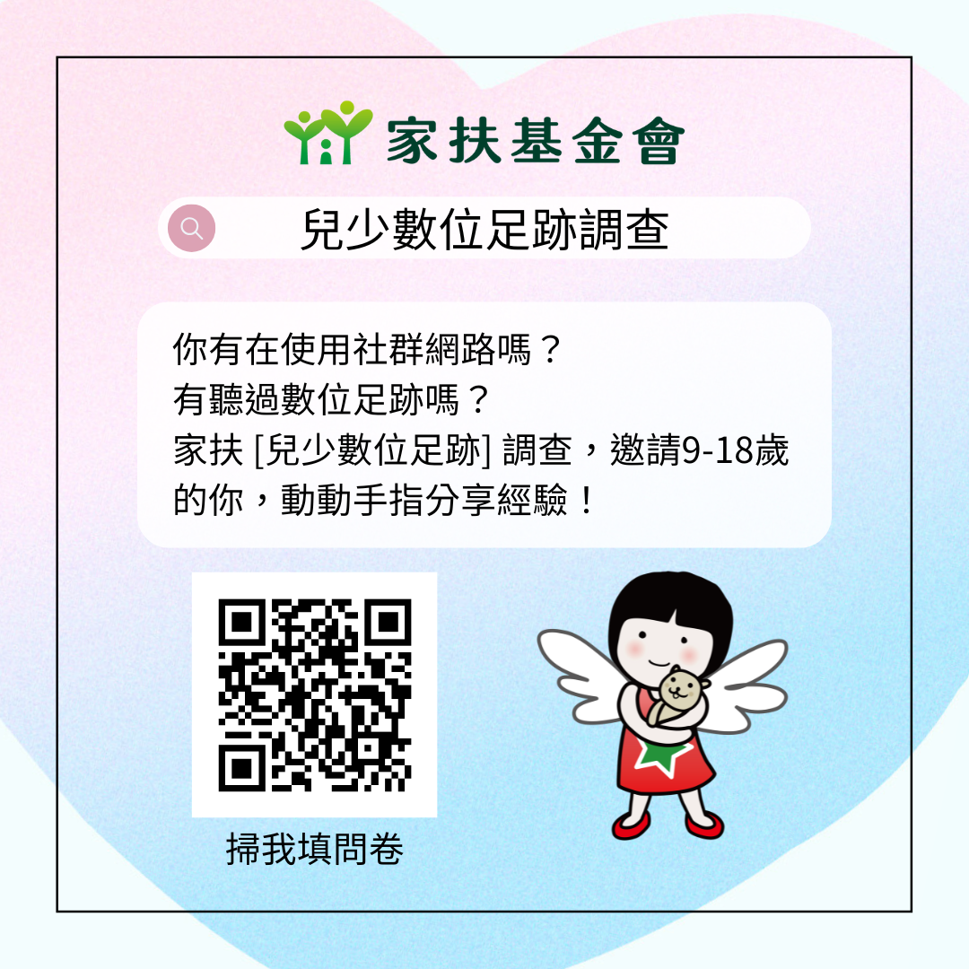 家扶基金會長期關注兒童及少年權益發展與實踐,為了解我國兒童及少年運用社群媒體/網路使用與數位足跡之情形,期以此主題進行調查和倡議工作。本次調查採用電子線上問卷,邀請9歲至未滿18歲年齡階段之各級學校學生填寫,並惠請協助公告此訊息。調查時間為:至日起至2025年1月31日(五);問卷網址:https://www.surveycake.com/s/BaDPV;問卷QR code,請參見附件。