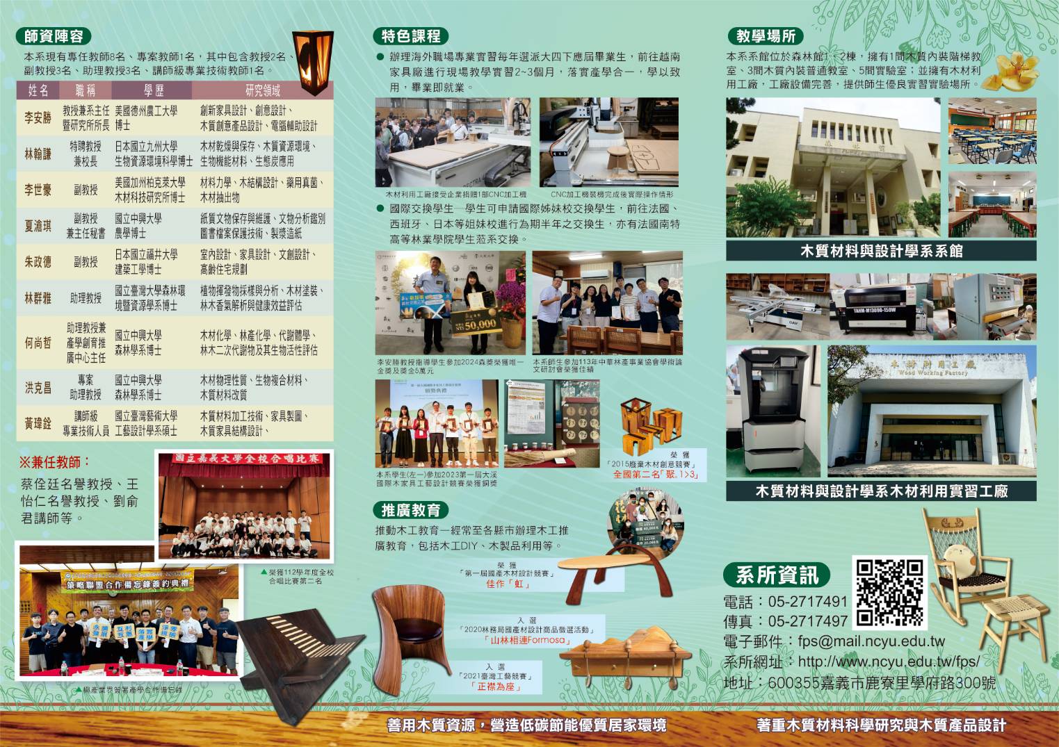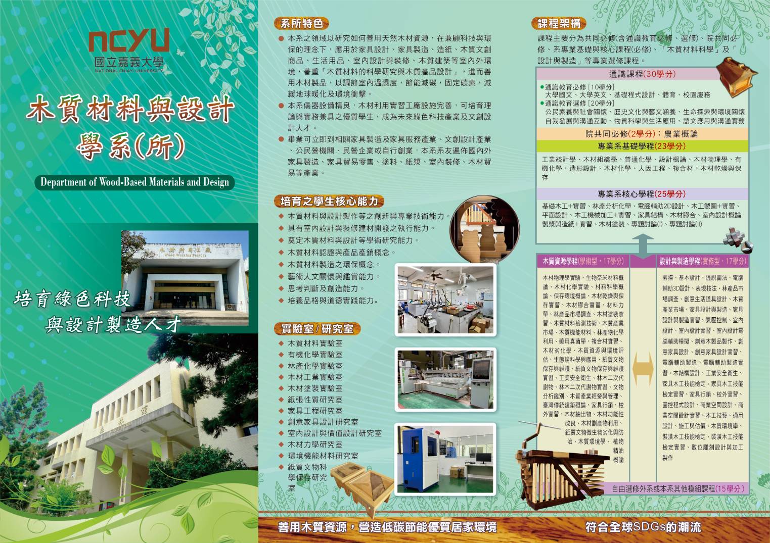 該系主要研究如何善用天然木材資源,在兼顧科技與環保理念下,應用於家具設計、家具製造、造紙、木質文創商品、生活用品、室內設計與裝修、木質建築等室內外環境,「著重木質材料的科學研究與木質產品設計,以培養綠色科技與設計製造產業人才,並結合固碳、減碳的環保政策,以符合SDGs世界潮流」。