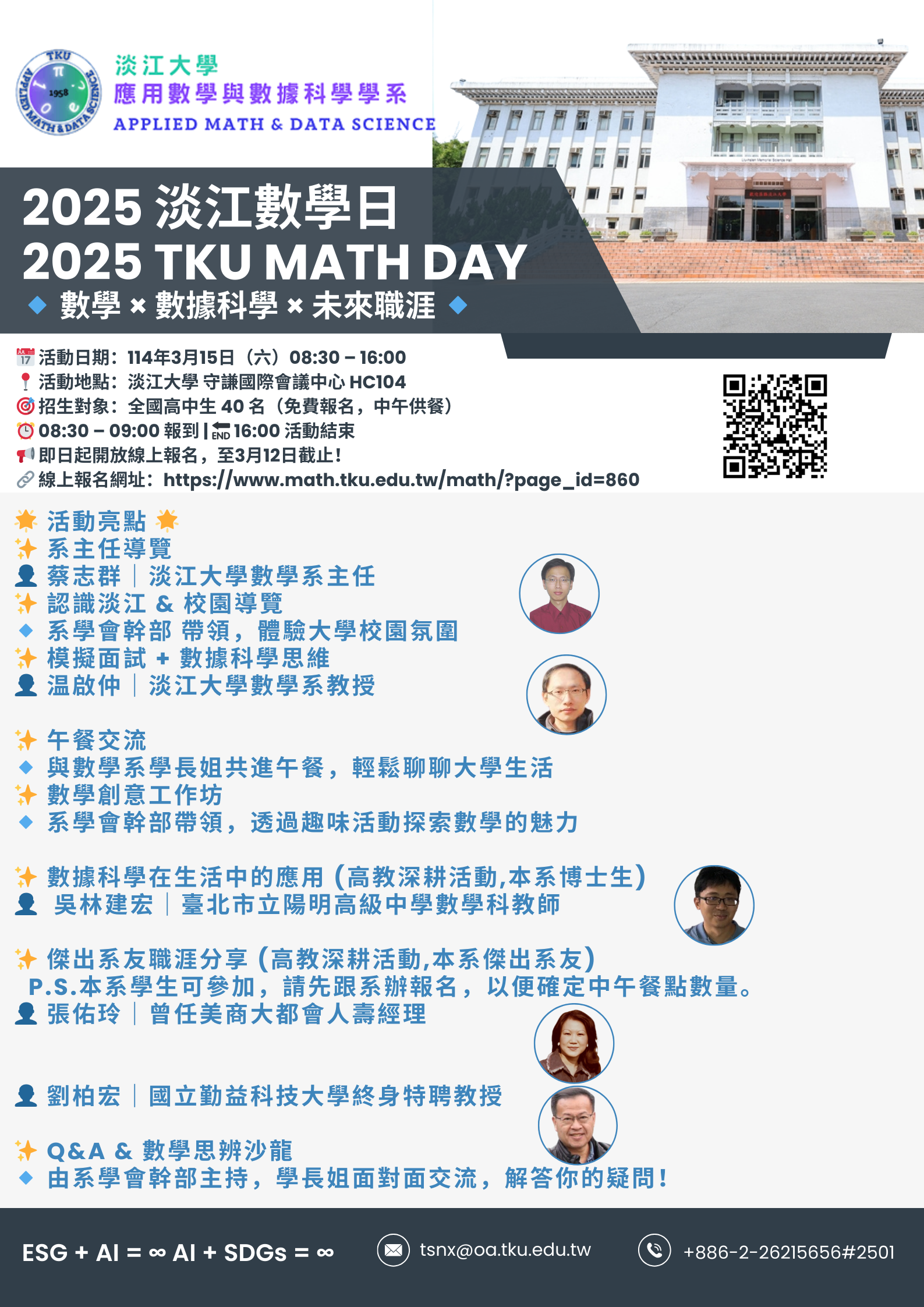 說明:一、旨揭內容包含系所介紹、模擬面試技巧與數據科學思維、數據科學在生活中的應用、傑出系友經驗分享及數學思辨沙龍。二、歡迎熱愛數學的高中生參加,招收名額為40名,報名網址:http://enroll.tku.edu.tw/course.aspx?cid=tsnx1140315。
