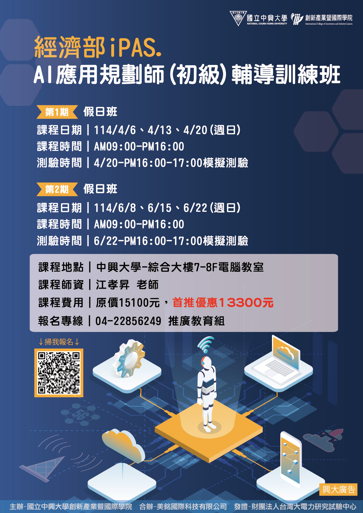 國立中興大學辦理「四證合一-經濟部 iPAS 淨零碳規劃管理師(初級)輔導考證班、經濟部iPAS-AI應用規劃師(初級、中級)輔導訓練班」招生訊息,即日起開放報名