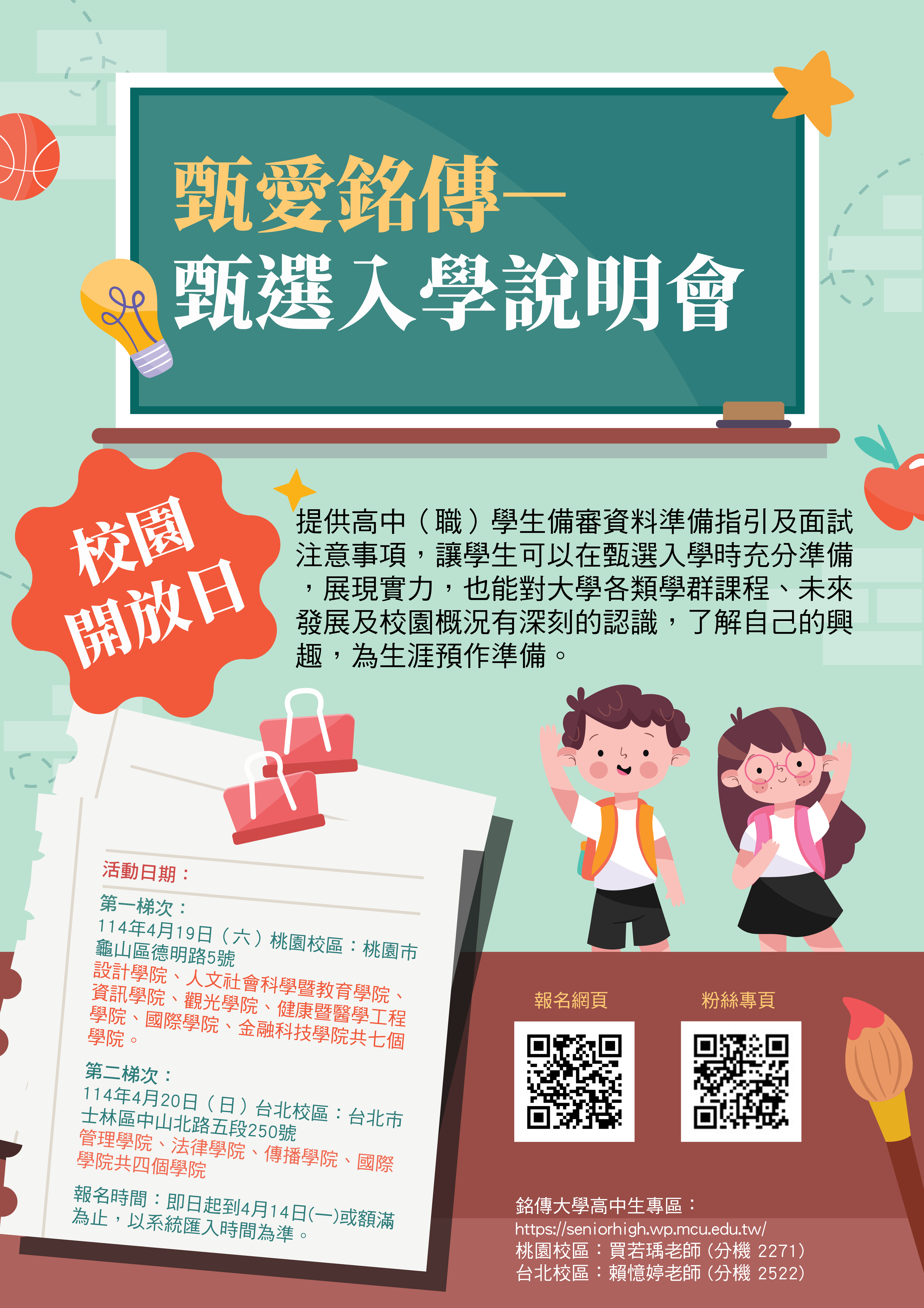 院辦理「甄愛銘傳-甄選入學說明會」校園開放日,即日起開始接受報名,額滿為止。