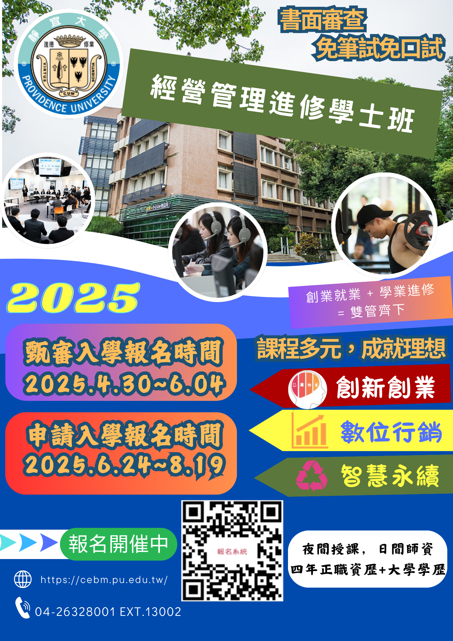 三、有關招生資訊可參閱本校進修學士班招生專區網頁,網址:https://adms.pu.edu.tw/p/426-1123-24.php?