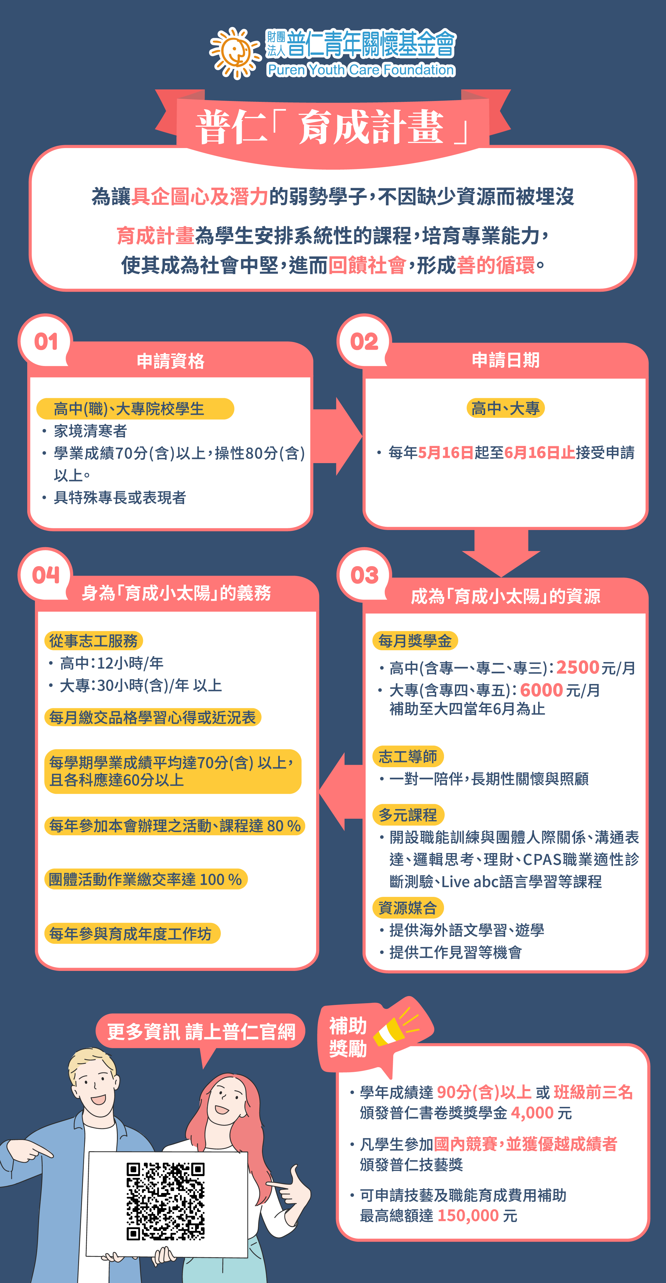 1.家境清寒高中(職)及大專院校在學學生,且學年學業成績平均70分(含)以上,操性80分(含)以上。