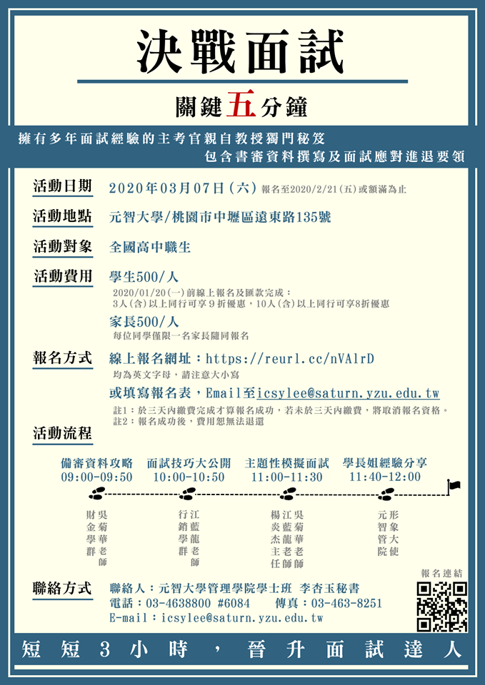 四、活動內容:含「備審資料攻略」、「 面試技巧大公開」及 主題性模擬面試與經驗分享。