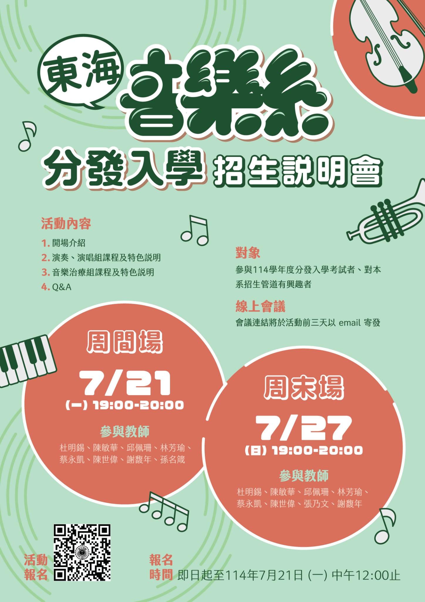 東海大學音樂學系辦理二場「東海大學音樂系分發入學招生說明會」活動海報