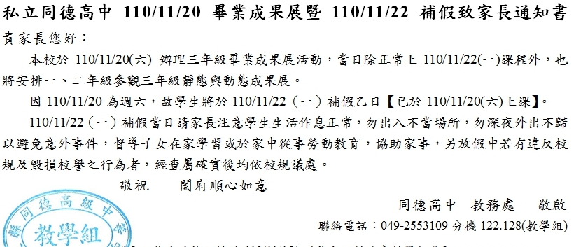 11/20(六)辦理畢業成果展,11/22(一)補假乙日