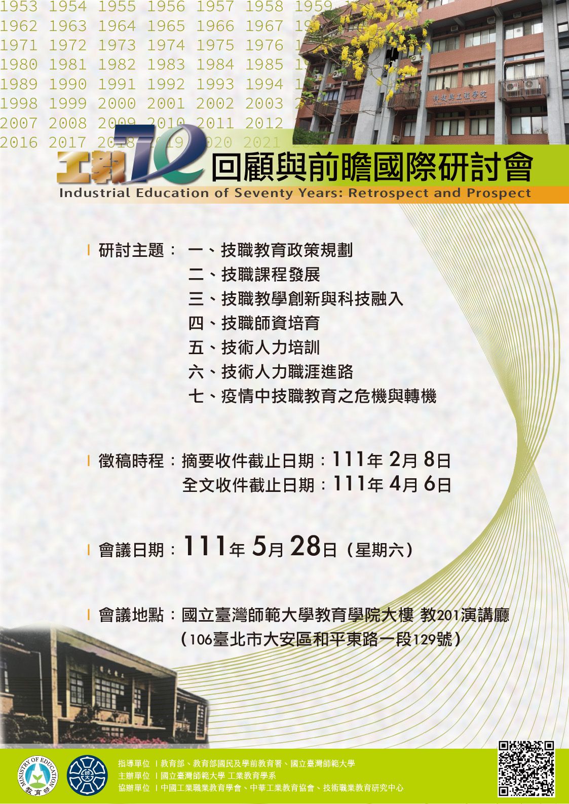 國立臺師大工業教育學系訂於111年5月28日辦理「工教70回顧與前瞻國際研討會」,論文摘要徵稿至111年2月8日截止