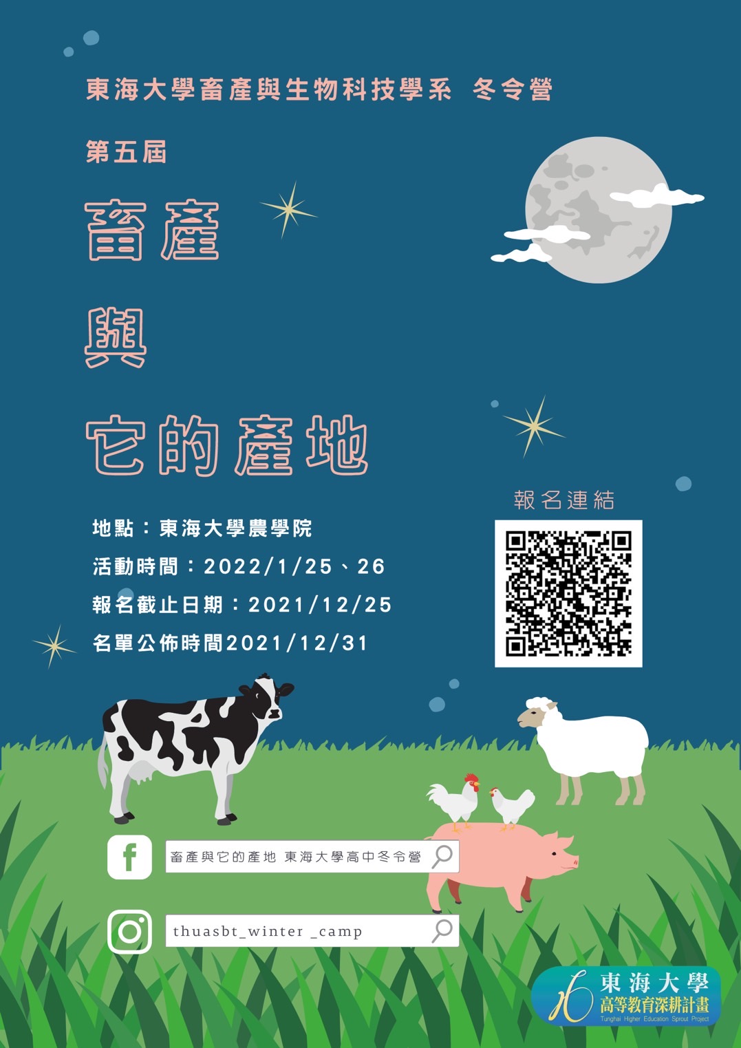 說明:一、活動宗旨:認識本校畜產與生物科技學系,並藉由活動過程,增進全國高中職生對畜牧生產產業的認知與專業素養。二、活動舉辦時間:111年1月25-26日。三、主辦單位:本校畜產與生物科技學系。四、參加對象:全國公私立高中職生。五、報名日期:即日起至110年12月25日止。六、報名網址:https://forms.gle/AM6nkafZmLTQCNYc6