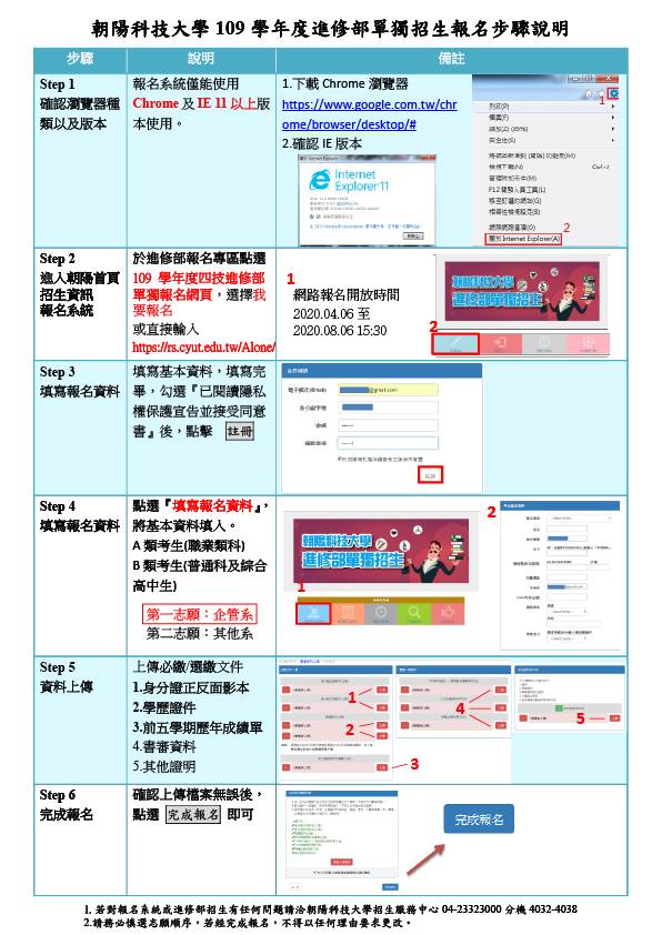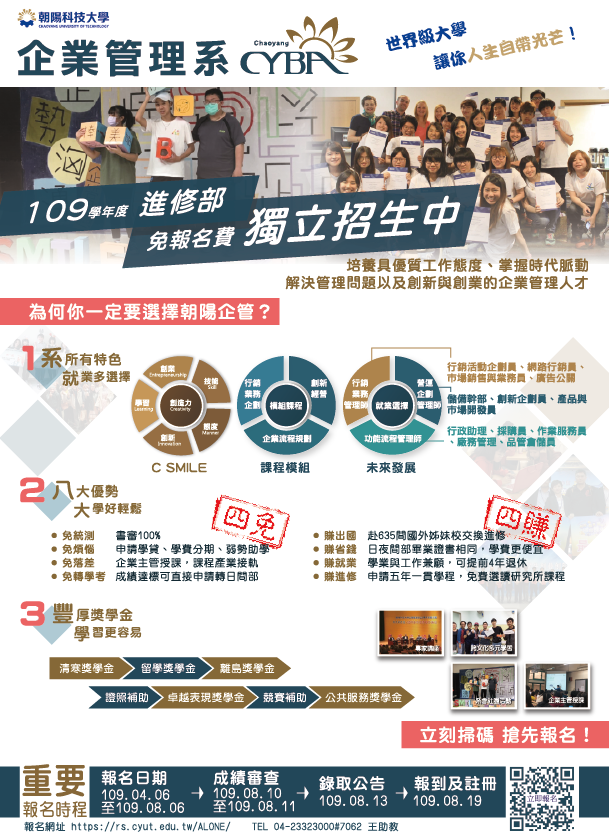 一、朝陽科技大學進修部單獨招生報名日期至8月6日截止,系所簡介請參考網址https://ba.cyut.edu.tw/。二、本項招生採書面資料審查,欲報名者請逕至網址https://rs.cyut.edu.tw/Alone/報名並上傳相關資料。