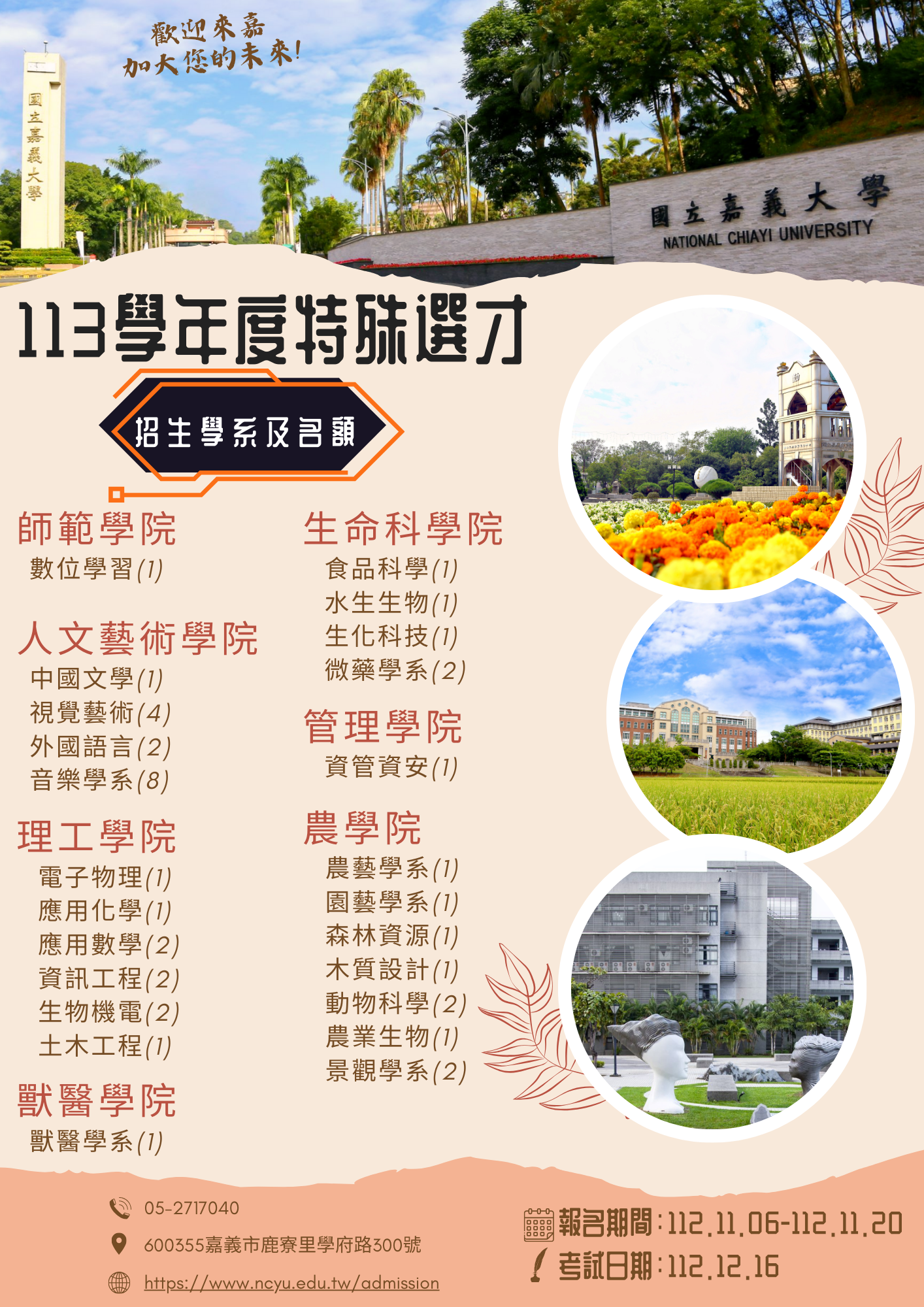二、檢附招生海報及招生簡章各1份,請惠予協助公告; 招生簡章亦可至本校首頁「招生資訊」/最新消息/113 學年度學士班特殊選才招生簡章下載(網址:https://website.ncyu.edu.tw/admission) 。