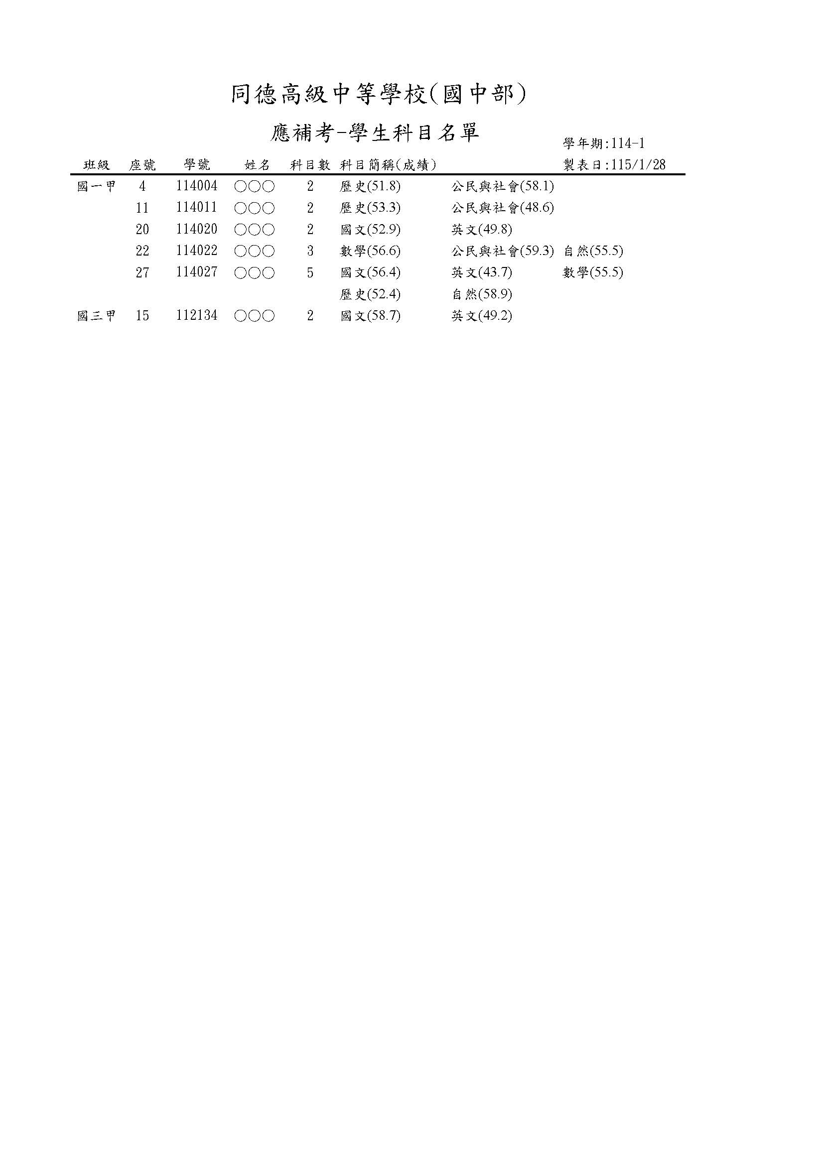 114學年度第1學期國中部各項成績查看與補考名單公布: