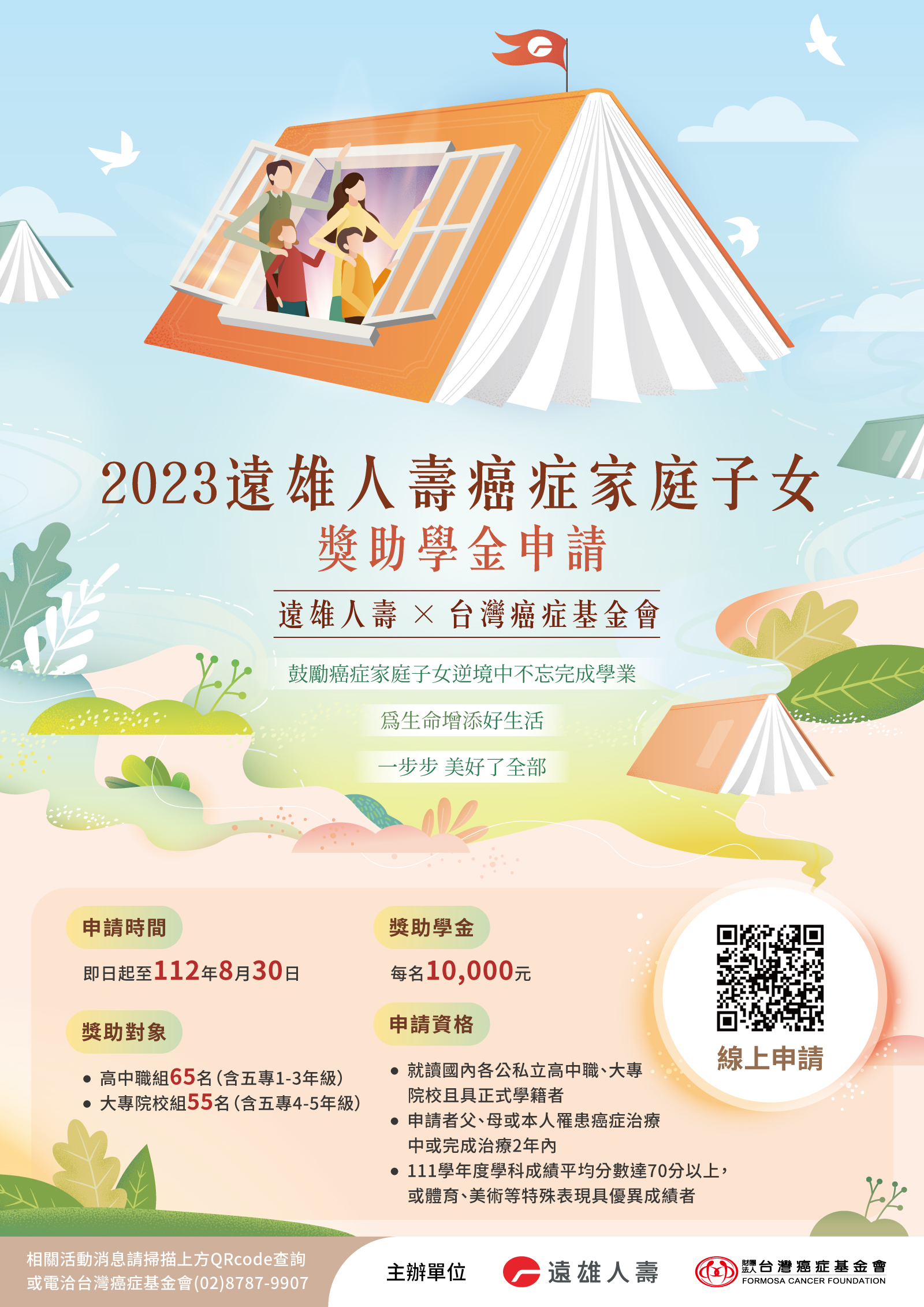 2、郵寄掛號:至台灣癌症基金會官網「最新消息」下載申請表,填寫完整連同檢附資料寄至105台北市南京東路五段16號5樓之2,並註明「2023台癌x遠雄人壽-癌症家庭子女獎助學金」 活動小組收」。