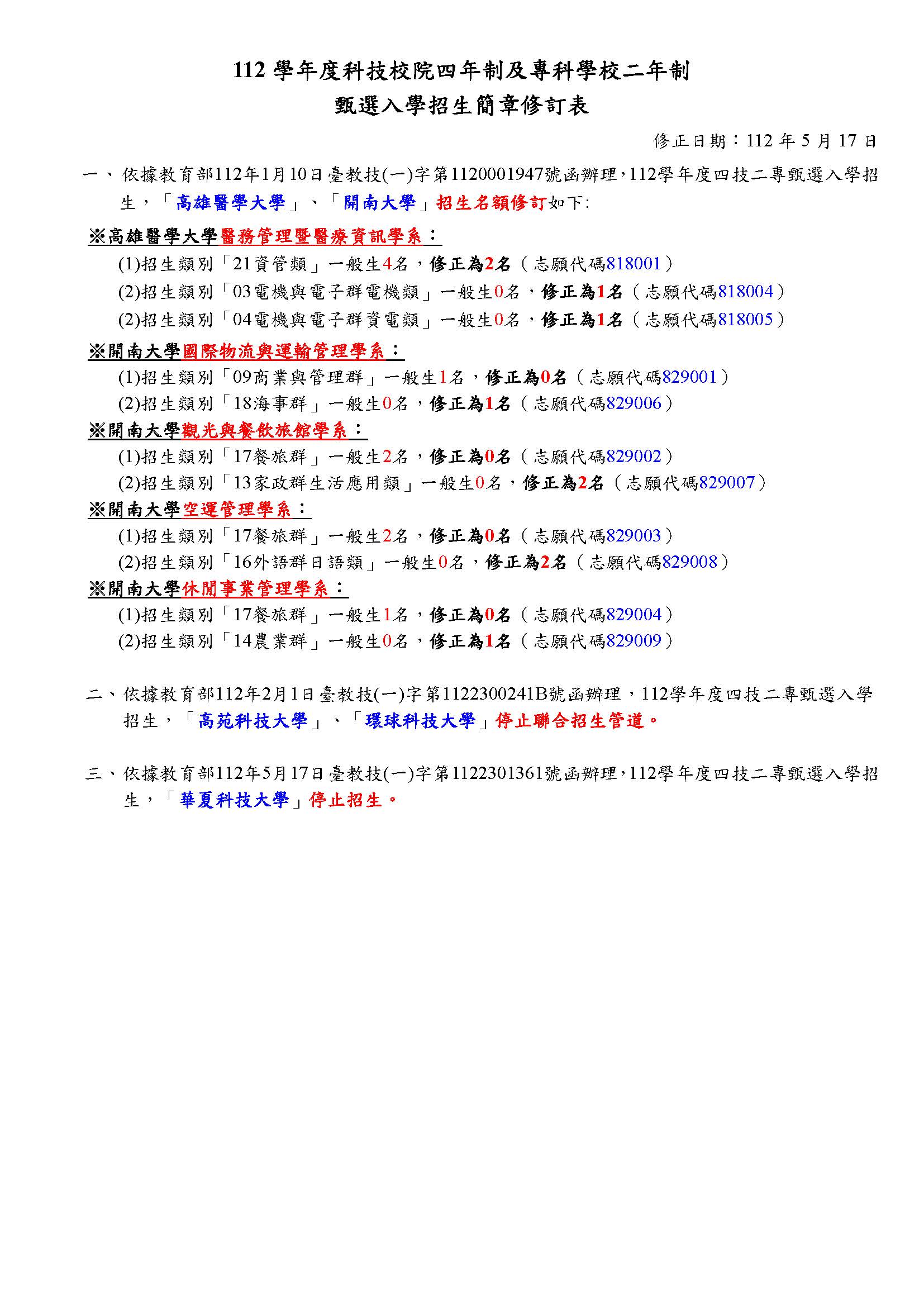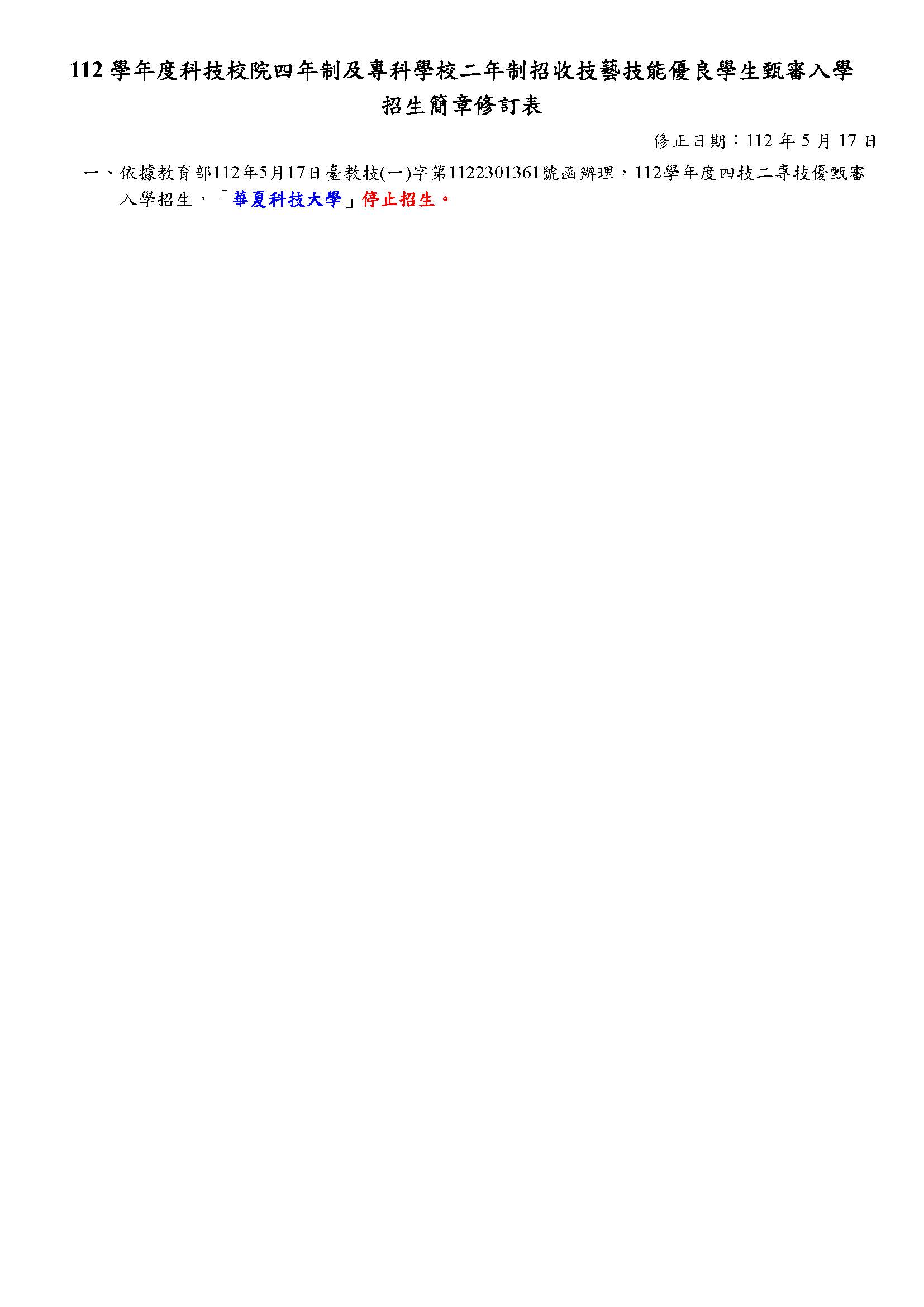 二、本次增修訂事項依據教育部112年5月17日臺教技(一)字第1122301361號函辦理,旨揭管道招生學校「華夏科技大學」本學年度停止參加招生。