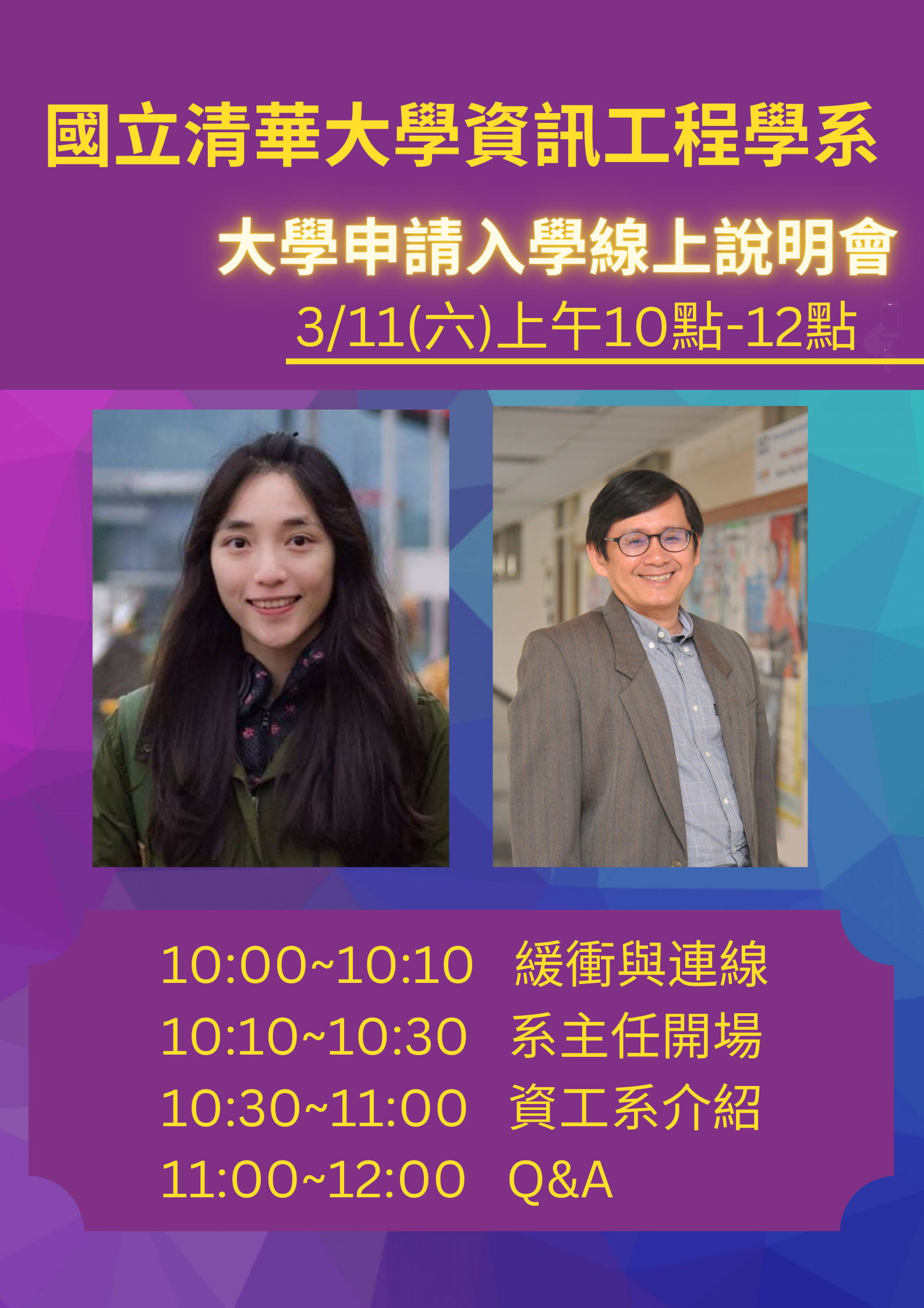 三、活動說明:活動流程詳如附件,另外,為有效了解高中應考生的疑問,活動當天上午11點至12點為問答時間,歡迎高中生與家長於3月8日(三)中午12點以前,點選上方活動報名連結,並於連結內填覆您的疑問,將由資訊工程學系系主任及專業師資團隊為您解答。