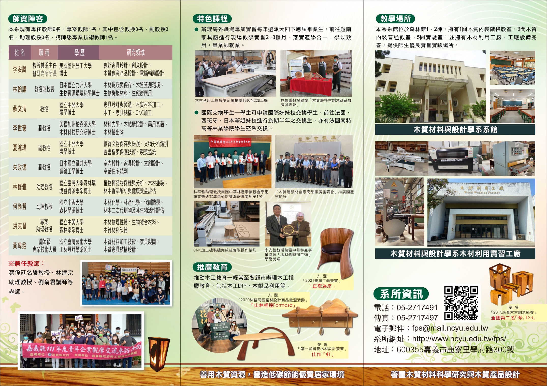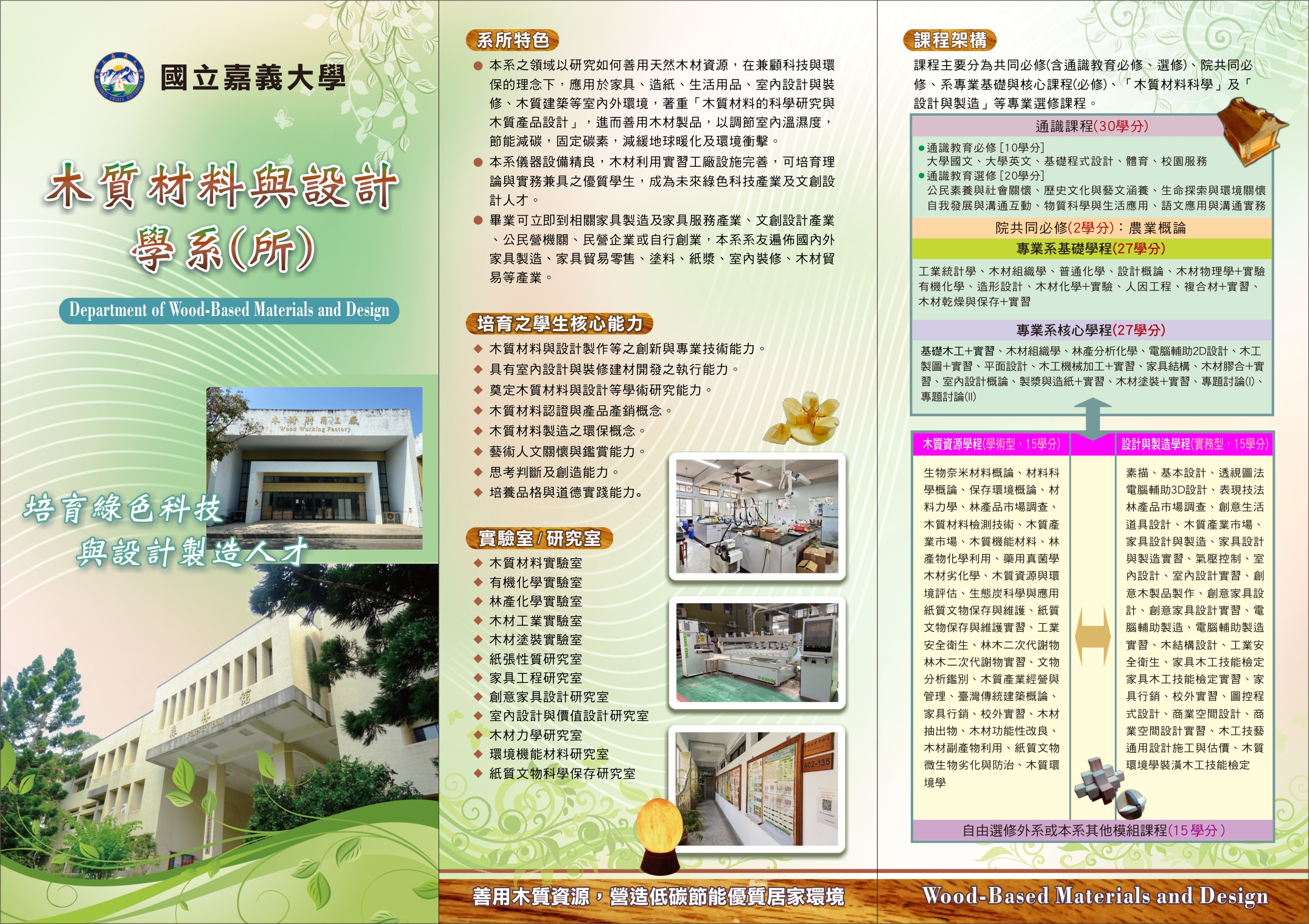一、該系主要研究如何善用天然木材資源,在兼顧科技與環保理念下,應用於家具設計製造、造紙技術、保健、生活用品、室內設計裝修、木質創意產品設計製造及室內外建築環境等,著重「木質材料的科學研究與木質產品設計」,以培養綠色科技與設計製造產業人才。