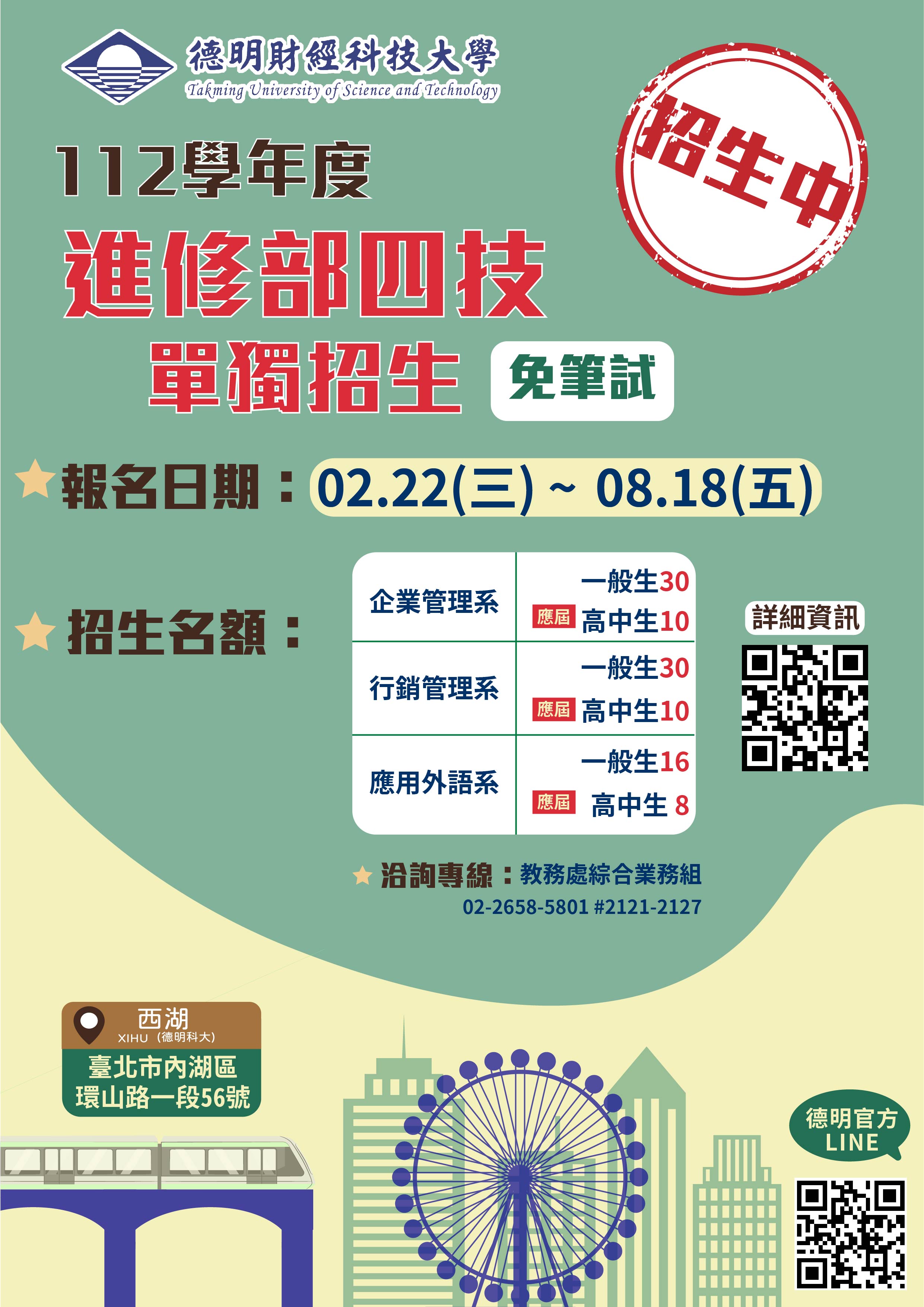 五、招生諮詢請洽本校教務處綜合業務組(02)2658-5801轉分機2121-2127或招生專線(02)7746-1888。