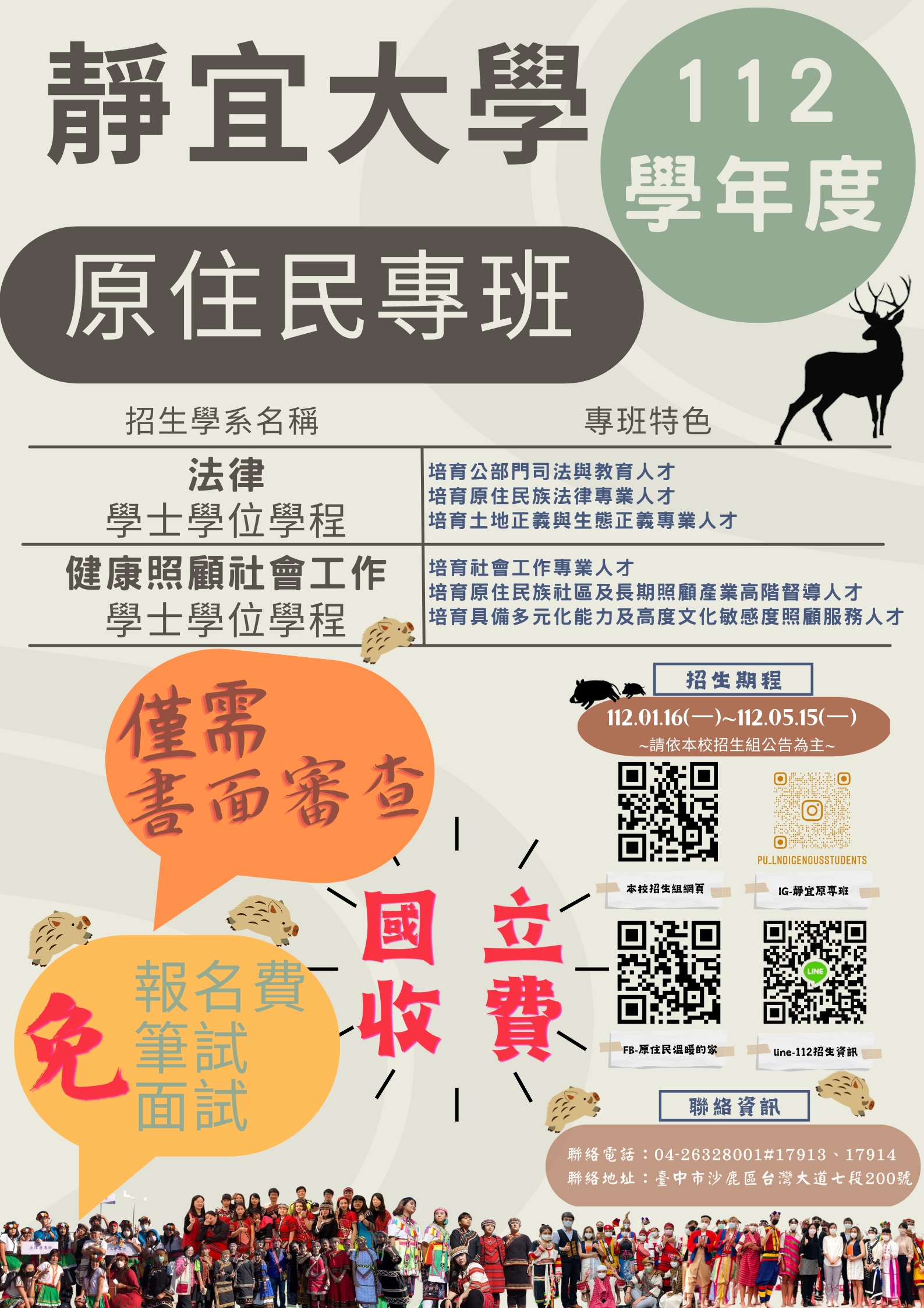 一、本校「112學年度原住民專班」共招收兩班,皆僅招收具原住民族身分學生,相關規定請詳閱招生簡章。