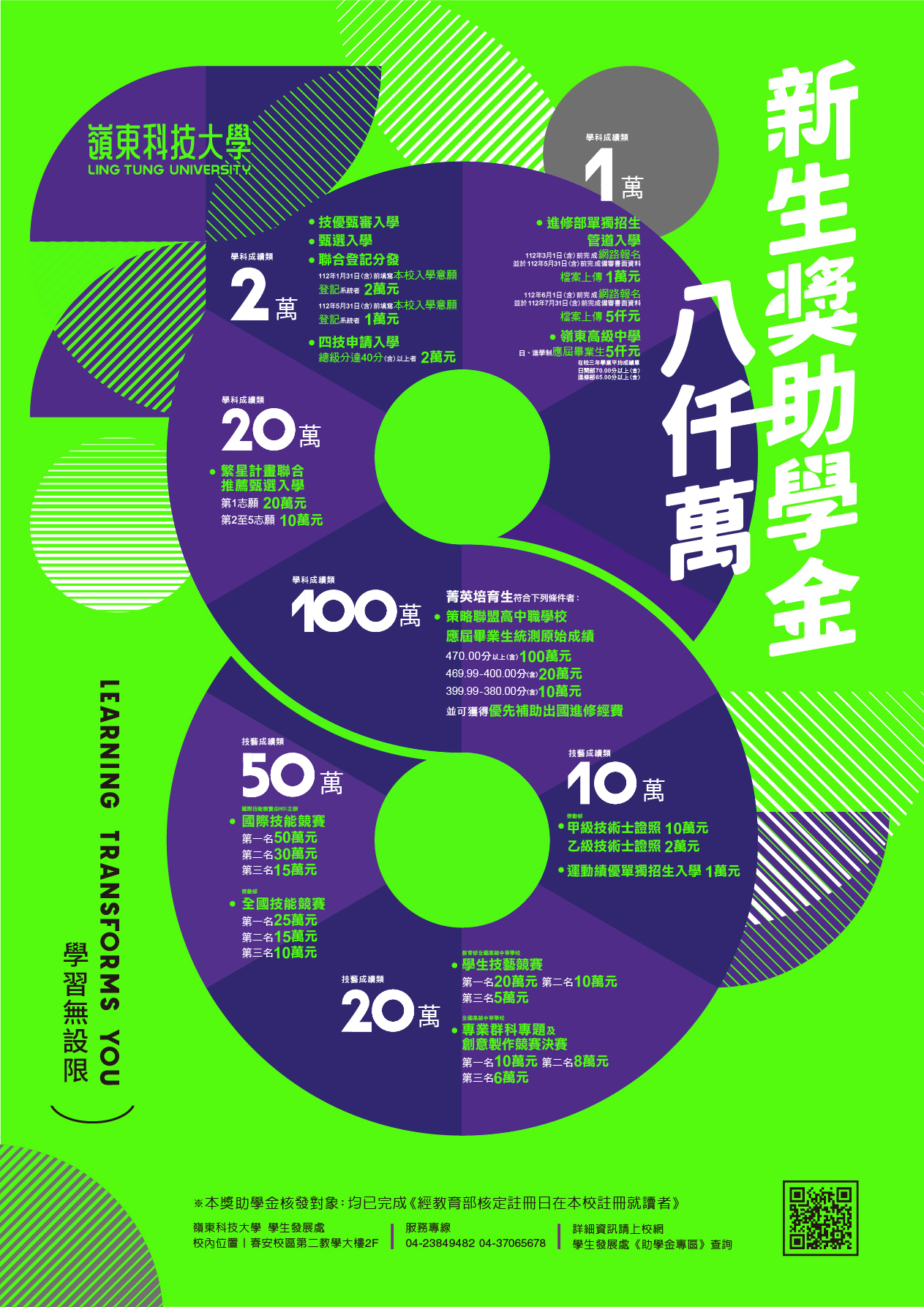 一、本校112學年度特提供新生入學成績優異助學金方案計新台幣捌仟萬元,敬請協助公告師生周知(如附件)。
