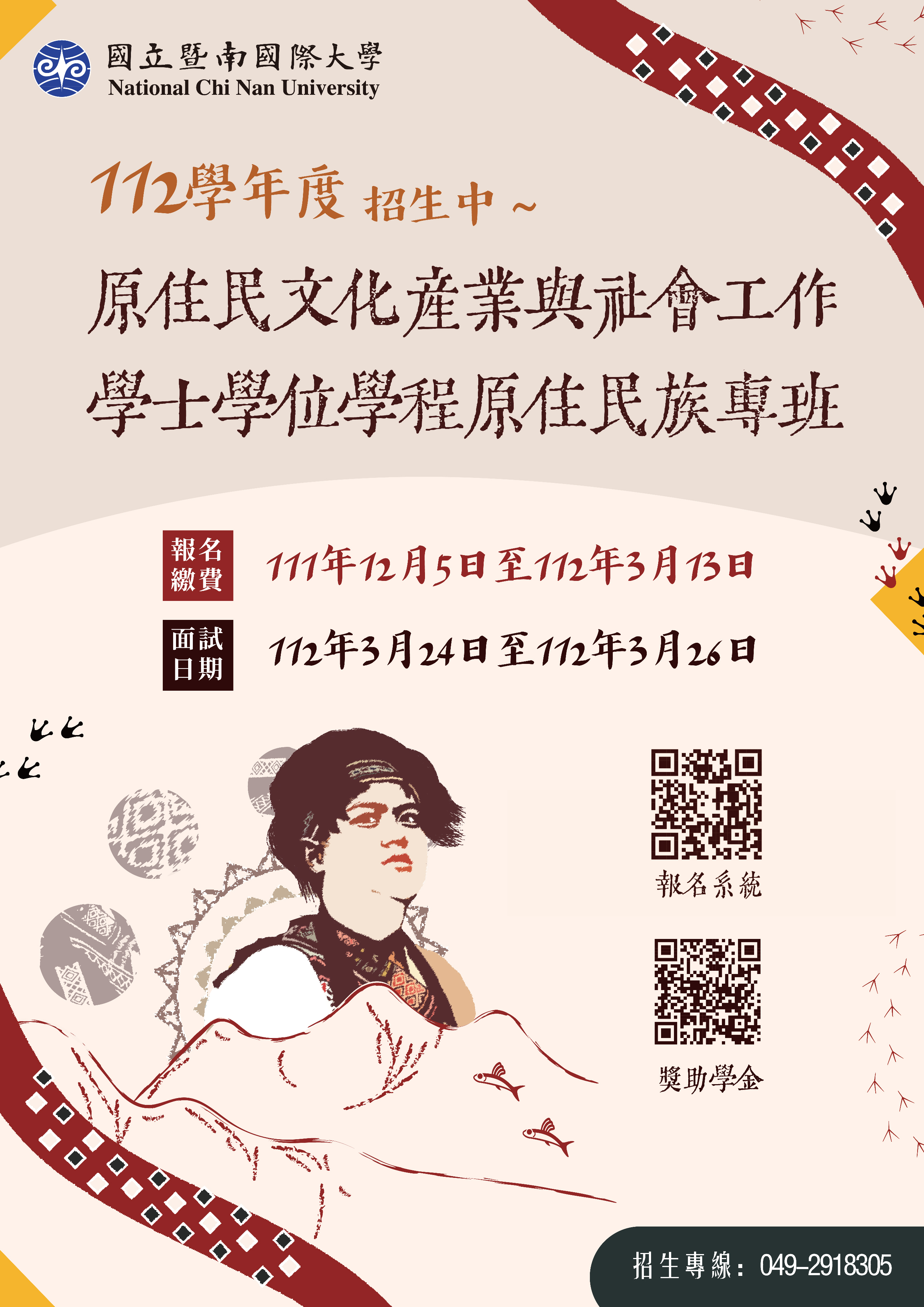 二、原住民族專班單獨招生簡章請至本校招生網頁自行下載,網址:https://www.admission.ncnu.edu.tw/