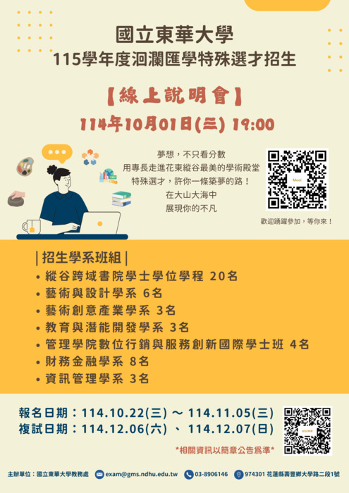 二、線上招生說明會時間為114年10月1日(三)19:00,歡迎踴躍參加。線上會議室網址:https://meet.google.com/vexfhbu-qdn 。